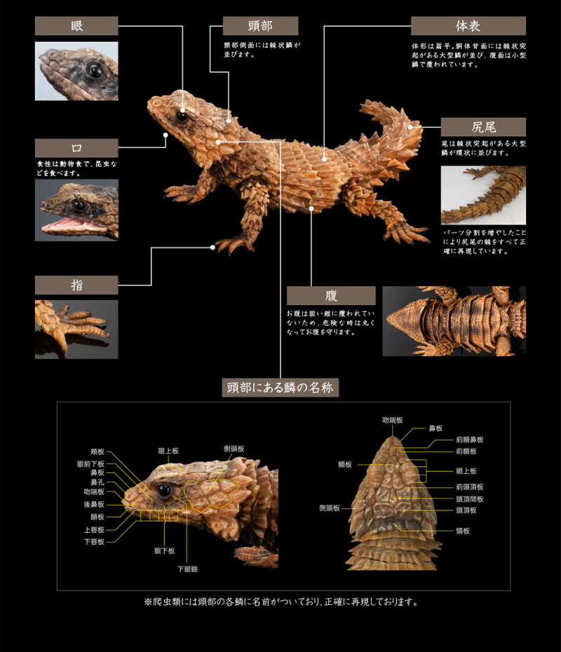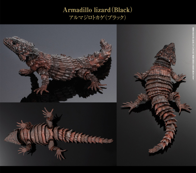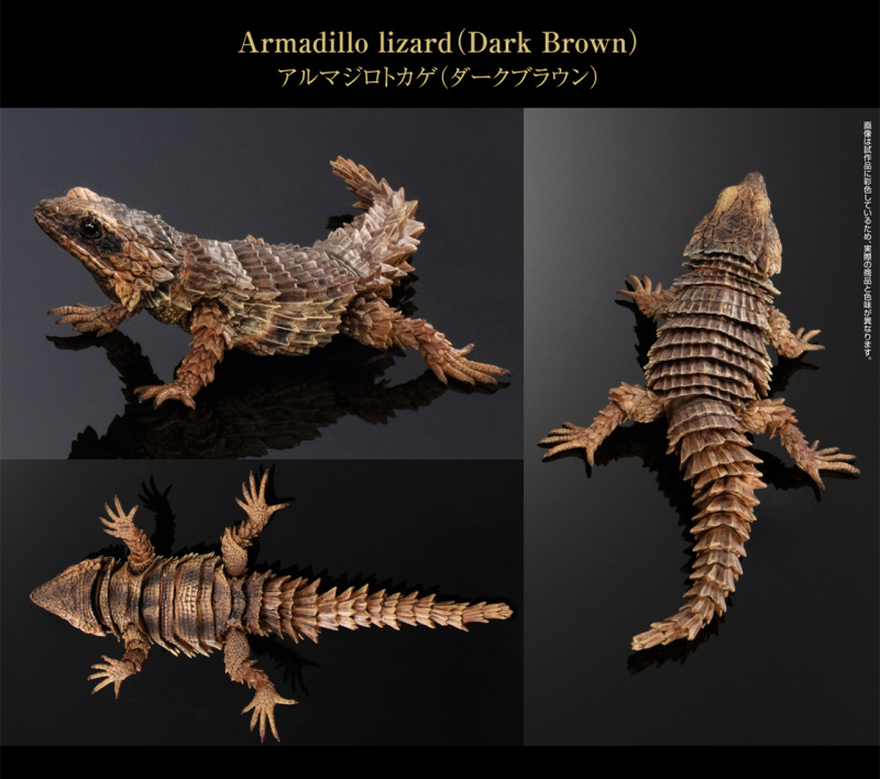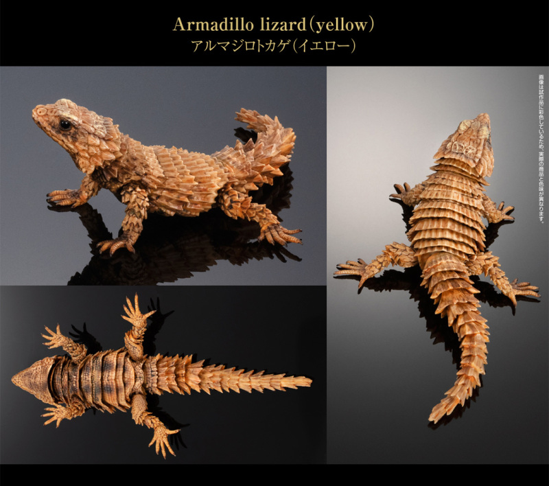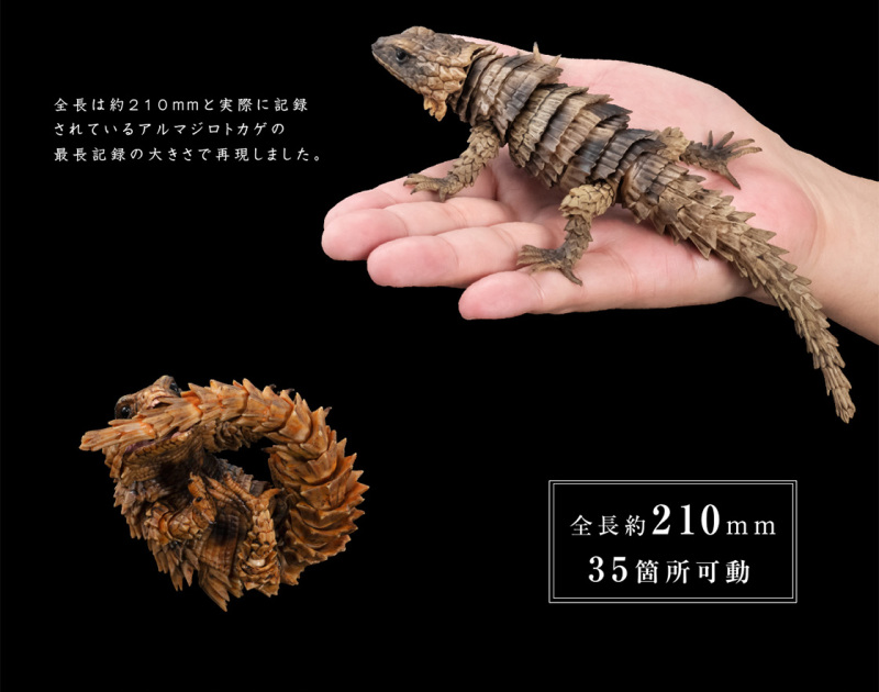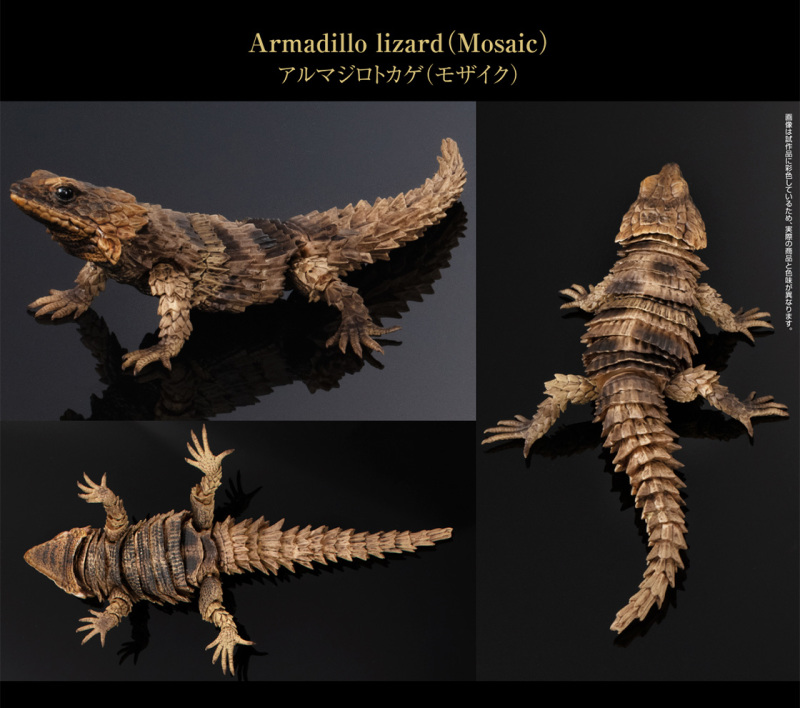 以犰狳蜥的最長記錄尺寸再現,全長約 210 mm,如盔甲一般的刺狀鱗片和圓形眼睛等細節被精細建模,全身具備 35 個可動關節,可以擺出自然的姿勢,生動展現張嘴威嚇,也能再現捲曲的尾巴、咬住尾巴防禦的狀態。邀請到日本生物造形家佐藤真啟擔任原型製作,並由爬蟲類專門雜誌《Vivalium Guide》的編輯長冨永明氏負責彩色監修,徹底重現身體複雜的鱗骨鱗片和生物感的擬真塗裝!
