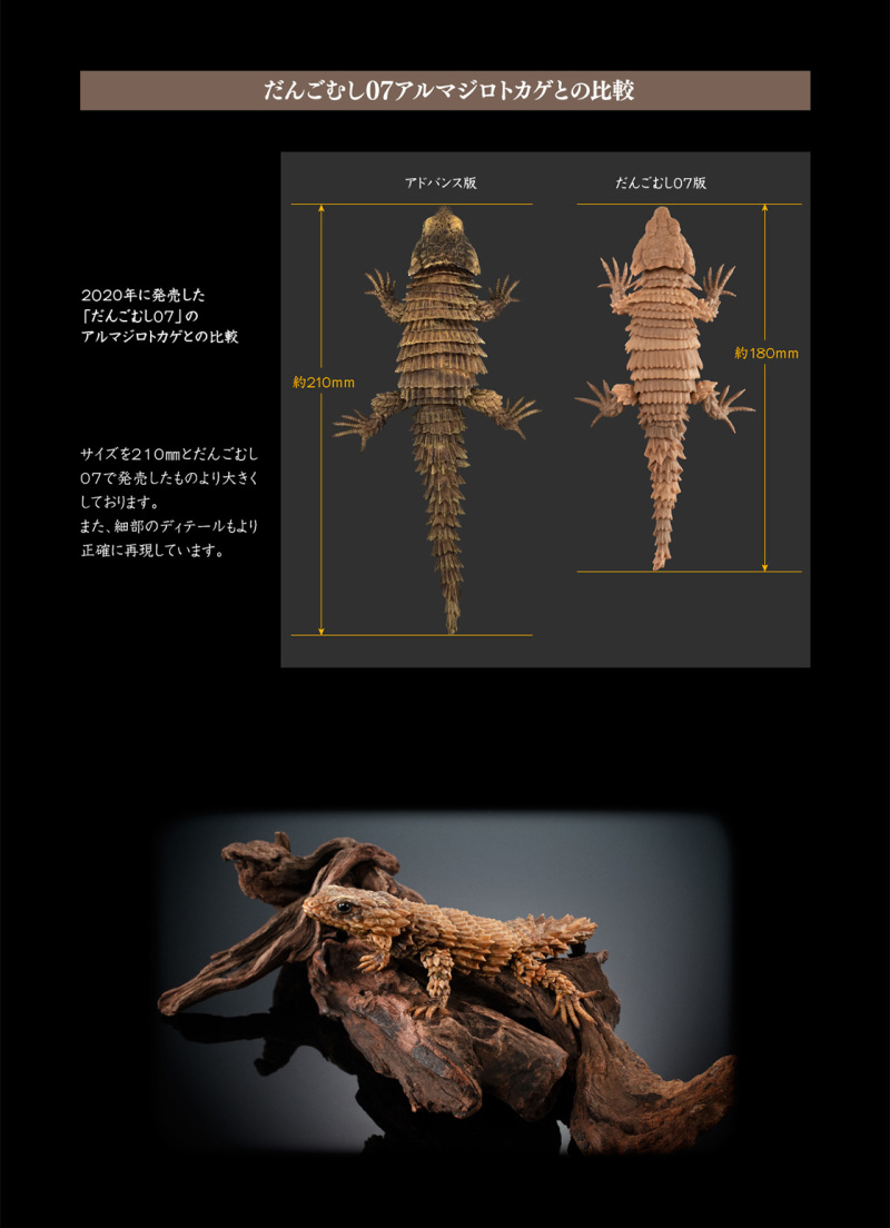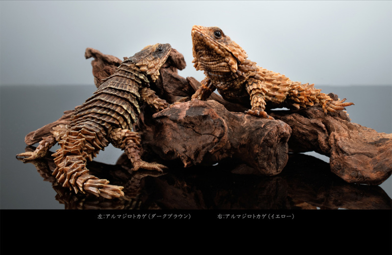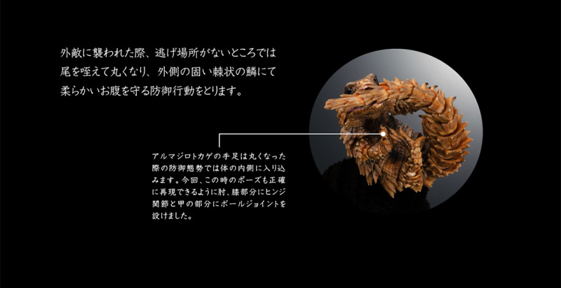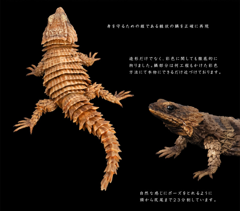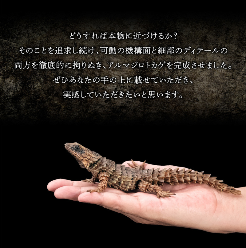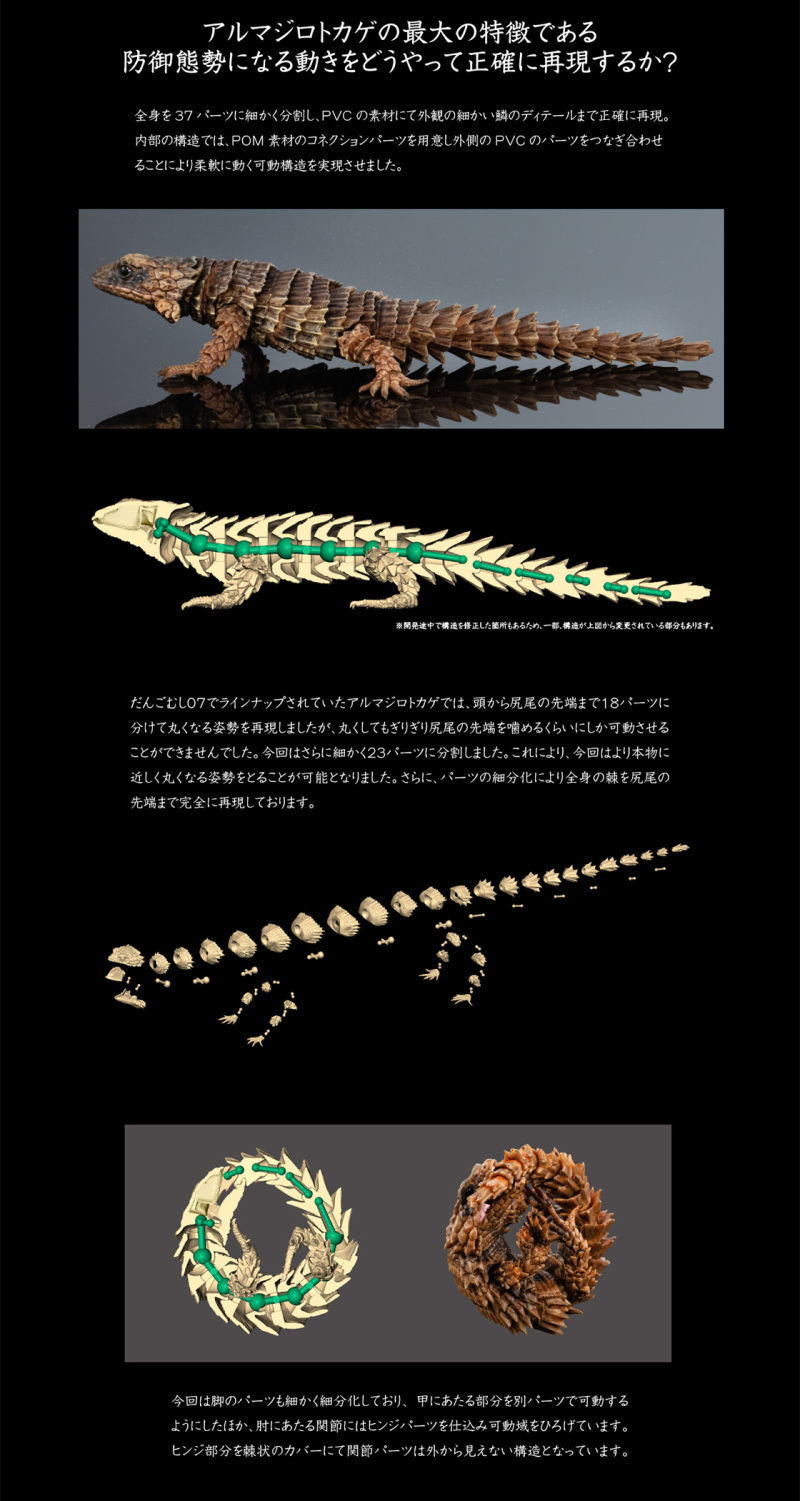 以犰狳蜥的最長記錄尺寸再現,全長約 210 mm,如盔甲一般的刺狀鱗片和圓形眼睛等細節被精細建模,全身具備 35 個可動關節,可以擺出自然的姿勢,生動展現張嘴威嚇,也能再現捲曲的尾巴、咬住尾巴防禦的狀態。邀請到日本生物造形家佐藤真啟擔任原型製作,並由爬蟲類專門雜誌《Vivalium Guide》的編輯長冨永明氏負責彩色監修,徹底重現身體複雜的鱗骨鱗片和生物感的擬真塗裝!