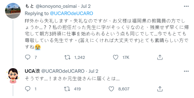 連推主自己也不敢相信會在推特上遇到爸爸的學生,更讚嘆世界真小,在推特上也能遇到素昧平生的人跟他一樣對爸爸感到尊敬。而這樣的網路相遇,也博得大量網友的關注轉推,對於能在推特上看到這麼溫馨感人的奇蹟,十分不可思議。