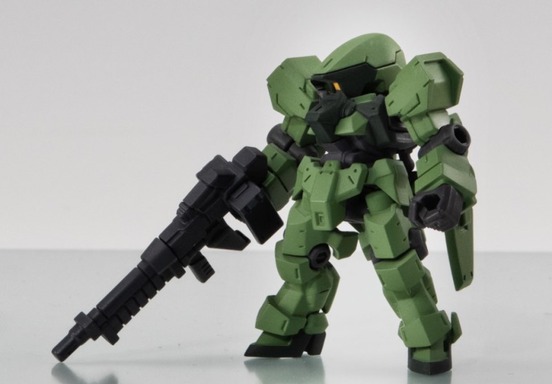 格雷茲則再現身為量產機極具魅力的軍綠配色、洗練裝甲造型。各關節採用相同規格的可動機構。主武裝步槍的比例相當巨大,與低頭身的本體搭配起來更具氣勢。