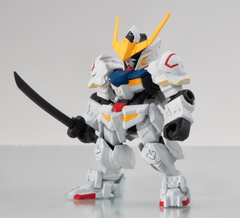 此次公開的機體是《機動戰士鋼彈 鐵血孤兒》最具代表性的主角機「獵魔鋼彈」以及敵方勢力末日號角使用的量產機「格雷茲」,兩架機體延續 MOBILE SUIT ENSEMBLE 系列風格,在高約 6 公分的低頭身尺寸下刻畫出高密度的細節造型,四肢關節、背部等處更有類似硬點的相同規格圓孔,能夠配同系列商品的零件進行換裝。