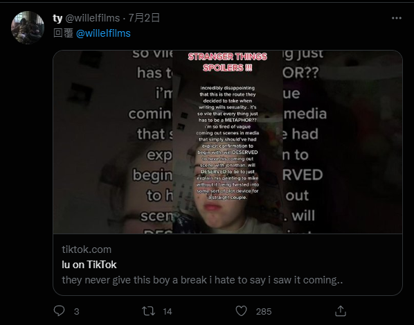 其中就有一名網友,日前在TikTok上發表一支影片,對於《怪奇物語》第四季中,遲遲沒有讓威爾表態「性取向」感到失望。在影片中她表示:「簡直不敢相信,難道劇組一直打算用隱喻的方式來表達威爾的性取向嗎?我厭倦了這種曖昧不明的演出,明明在威爾與哥哥強納森的橋段時,就可以安排出櫃的場景,甚至在威爾向麥克分享他的畫時就可以有所坦承,而不是包裝成異性戀男女的偽裝。」