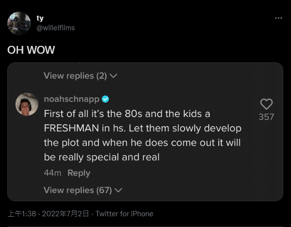 雖然對於威爾是否為同性戀一事,我們不曉得會不會在《怪奇物語》第五季中有所解答,但顯然該支影片也成功吸引「威爾」諾亞·施納普(Noah Schnapp)的注意,並留言回應:「首先,這裡的時間背景是80年代,劇中的孩子都還是個新鮮人,就讓他們慢慢地在劇情中發展,而當結果出來時,你就能從中體會到真實與特別。」