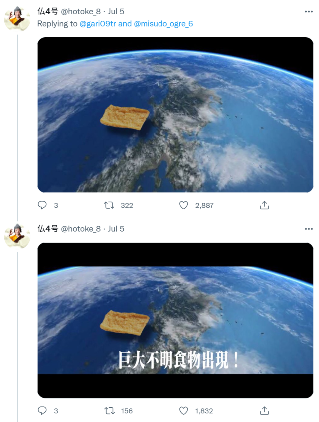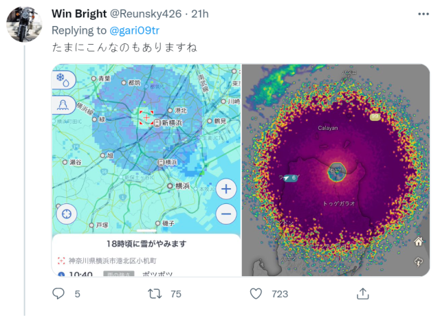 但也有網友解釋,由於氣象雲圖通常是以雨雲的中心畫出這樣圖形,可能剛好周邊的雲團聚集的樣貌就剛好是這個形狀,其實在氣象雲圖上有時候也會出現很多奇妙的形狀,所以並不是很少見。不過這樣的奇妙現象也意外的引起網友討論發想,只能佩服日本推特網友的想像力了 XD。