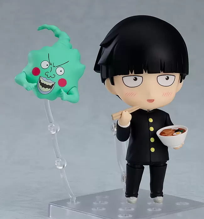 「黏土人 影山茂夫」可動人偶,尺寸全高約 10 公分,Q 版原影山茂夫特色的西瓜皮與制服造型,附有淡淡無表情的「普通臉」、眼神銳利的「覺醒臉」與雙頰泛紅不好意思的「害羞臉」三款替換表情零件,搭配替換手勢以及上級惡靈「小酒窩」、彎曲的湯匙、拉麵&筷子等配件,賞玩劇中不同情境~另外,還附有頭髮向上衝的替換髮型零件,重現100%的路人覺醒狀態!