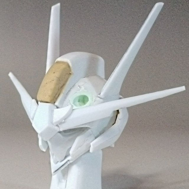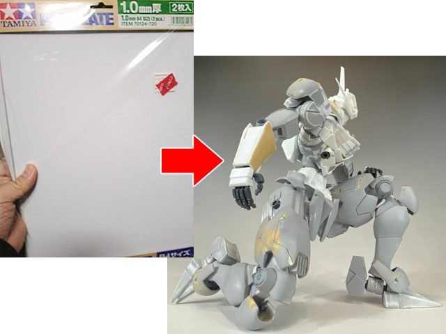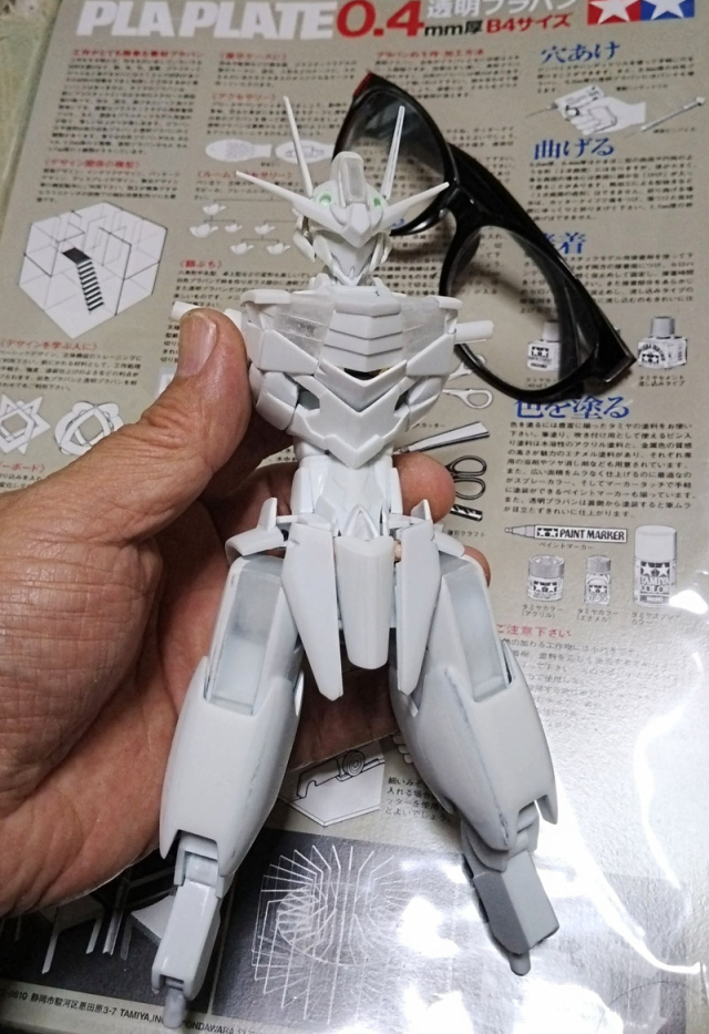 雖然是個「板子」,但流程基本上就跟普通鋼普拉一樣,身體各部位都剪裁、修邊、打磨好後再一一組裝上去,說起來很簡單,但因為不是正常的鋼普拉所以組裝時一定得更小心,而且組裝說明還只得看官方釋出的機體造型而不是零件組裝示意,所以必須靠著想像力和對照原作造型來組,要是錯一個可能就成為另一種機體了。