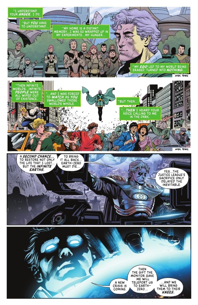 首先以這次的大反派之一的「賤民」(Pariah)的角度回顧了過去的事件。當時的他造成了無限地球危機,而現在他被承諾了可以救回他曾經失去的一切的機會。無論如何,他都會把零號地球(正史宇宙)給犧牲掉,來挽救自己的過錯。