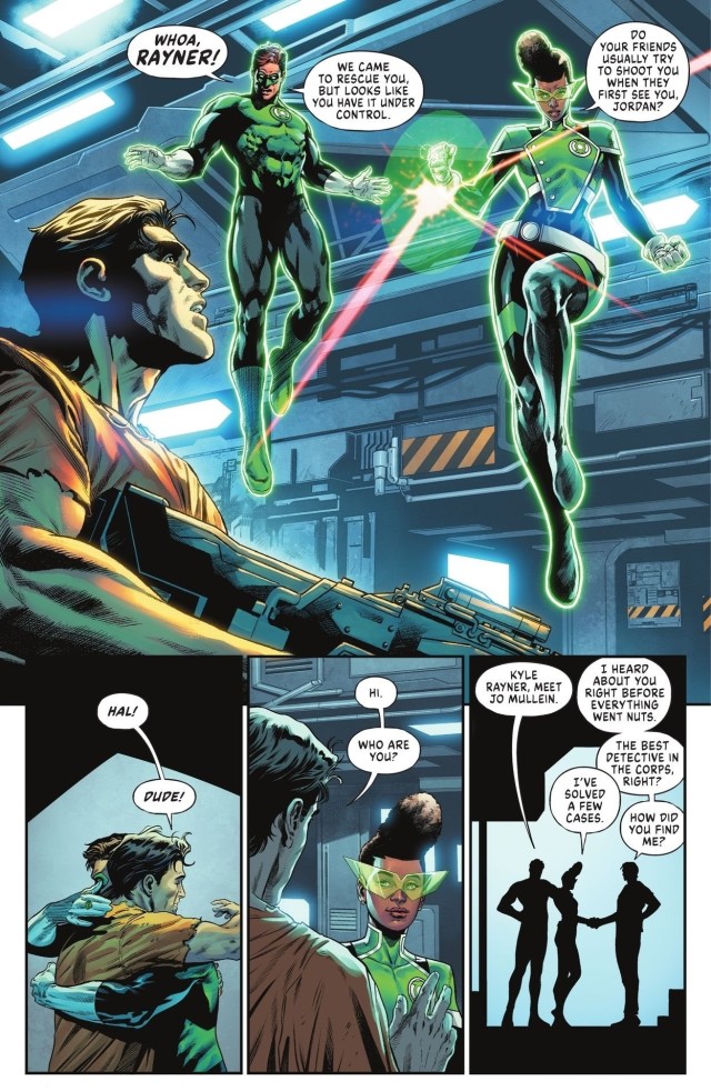 而在太空中,地球綠光戰警之一的凱爾‧雷納(Kyle Rayner)被關押在一艘太空船之中。正當他憑著一己之力逃脫了監禁的同時,綠光戰警哈爾‧喬丹(Hal Jordan)與喬‧慕蓮恩(Jo Mullein)剛好也趕到了現場,招募他加入對抗黑暗勢力的戰鬥。