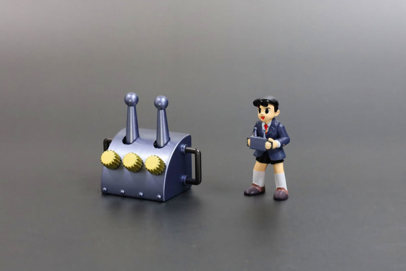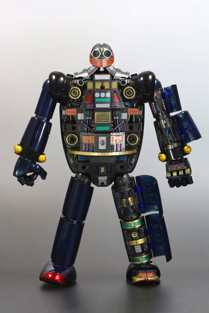 內部構造完整地再現,配件部分,有附操縱者正太郎的迷你人形,操縱鐵人的遙控器。鐵人的眼睛可以替換配件呈現不同效果,內部也可以透過安裝LR44電池發光,搭配多樣的可動姿勢,喜歡另一種不同色系的鐵人28的朋友,不妨參考看看。