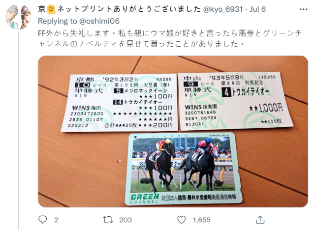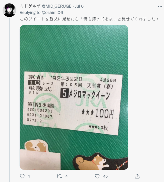 人氣手遊《賽馬娘Pretty Derby》近期推出繁體中文版,讓這款遊戲熱度瞬間又燃起,搭配大量的電視與實體廣告,可以看出在台灣的馬娘風潮正掀起一股旋風。日本最近一位推主おしみ(@oshimi06)分享了一件趣事,熱愛馬娘的他一日間跟父親閒聊,老爸送給了推主一個禮物,居然是 30 年前的經典賽事賽馬券,讓推主感動不已。推特網友也大讚 : 「這給馬娘粉最棒的親子禮物 ! 」