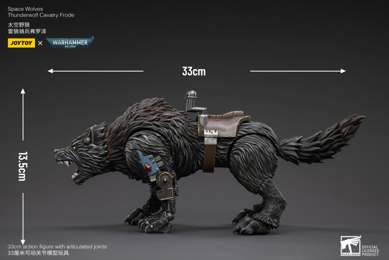 JOYTOY 所推出的1/18比例雷狼騎兵,以上個月推出的新素體來製作,雷狼騎兵的精工動力甲上的狼圖騰與符文造型完全重現,並附屬了鏈鋸劍、等離子手槍以及盾牌作為配件,比較可惜的是缺少了霜獄斧;雷狼是全新出現的單位,毛髮的紋路、兇狠的神情以及改造的金屬義肢全都一一重現,並且設置有可動關結構造,能夠重現各種不同的凶猛姿態。 值得留意的是,雷狼的鞍上設置了把手,讓人偶能夠穩固地固定在雷狼背部,這是JOYTOY 1/18 《戰鎚40000》系列中首度出現與原版戰棋不同的作品。