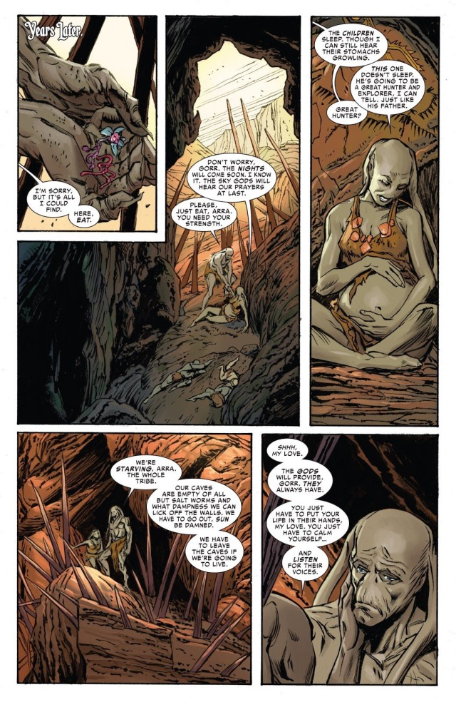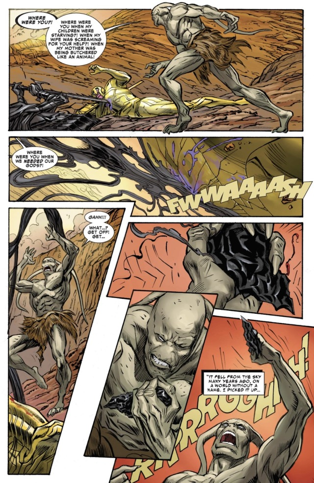 電影開場是反派「屠神者戈爾」的起源故事,只見他的家人飽受乾旱之苦,向天禱告祈求甘霖,最終女兒在自己的懷裡死去。漫畫中「屠神者戈爾」是無神論者,直到家人一一餓死後,才發現神真的存在,遂展開復仇。