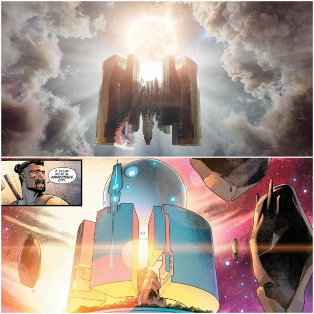 索爾一行人來「全知之城」尋求宙斯與眾神協助,卻發現眾神已經墮落於酒池肉林的生活。 「全知之城」在電影中的設計參考自漫畫,漫畫中這裡也是宇宙眾神集會的地方。