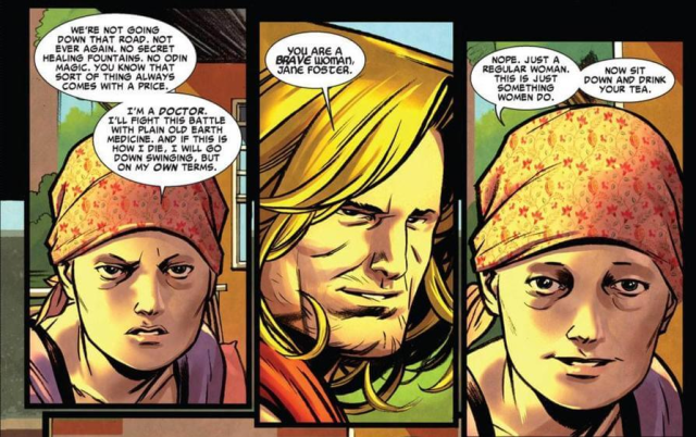 電影中珍自願借助雷神之力,來對抗癌症。但在漫畫中,珍一開始拒絕以神力抗癌,堅持以自然醫學來面對。