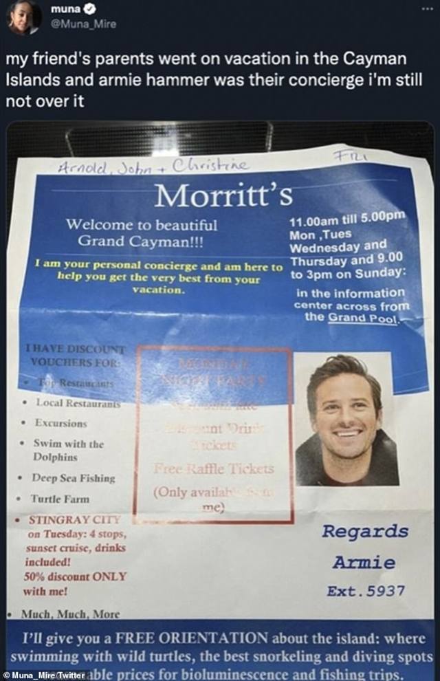 這整件事的起頭是有位好萊塢製片人在推特爆料,他朋友的父母去開曼群島度假的時候發現漢默本人就在當地渡假村擔任私人接待員,還上傳一張渡假村裡印有漢默照片的傳單為證(上圖),但事後渡假村的員工出面澄清,這張傳單純屬惡作劇,漢默其實是渡假村的客人,而製作傳單的人是那些與漢默混得很熟的渡假村員工,是他們把傳單發送到渡假村內的各個房間,試圖引起注意。漢默的律師也回應那些傳單確實是假的。