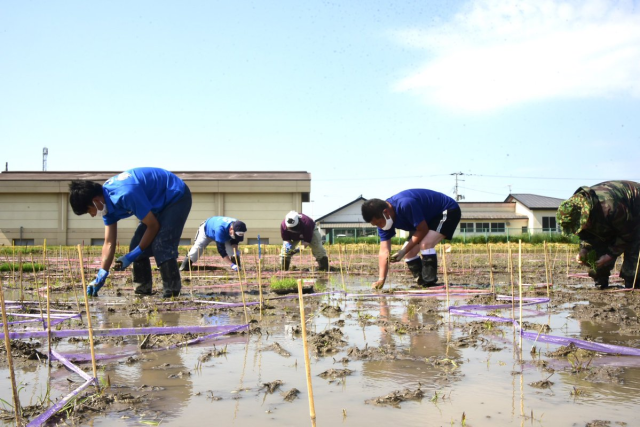 稻田藝術創作也是由該地農人集結辛苦工作製成,可以看到下圖農人辛苦插秧就是為了這幅創舉。