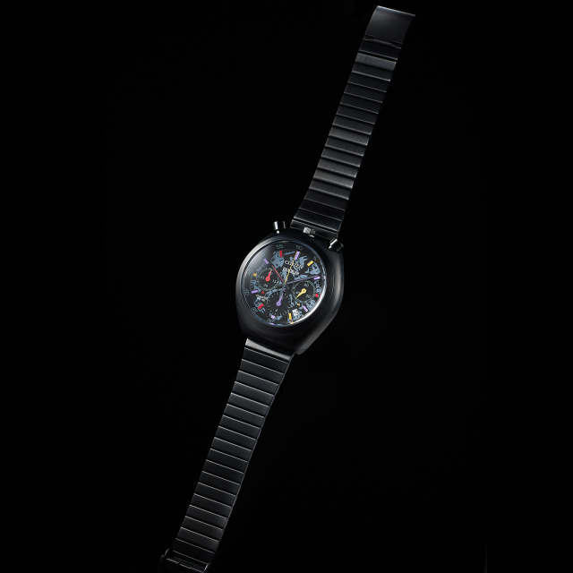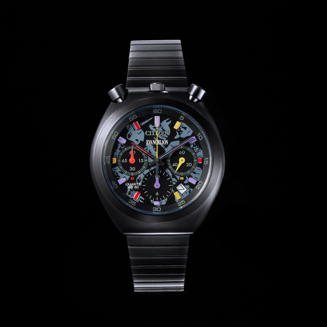 以 CITIZEN 在 1973 年精典的錶款「TSUNO CHRONO」為手錶樣式,該款也是眾多名人與明星配戴的愛用款。這次與 RADIO EVA 聯名,整體採用沉穩的黑色為基底,在錶面上融入了品牌獨有的初號機頭顱滿版圖案設計,搭配指針的色系採用初號機的紫色、二號機的紅色以及零號機的黃色為靈感,打造出專屬福音戰士的聯名錶款。