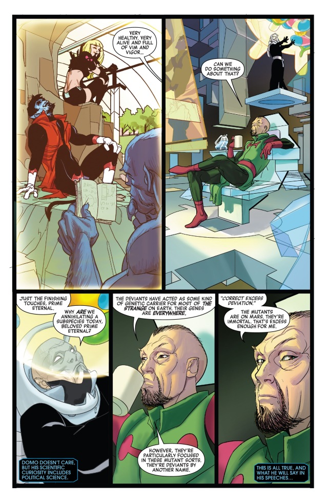 於是他找上永恆族城市奧林匹亞(Olympia)的首席科學家多摩(Domo,電影版的永恆族飛船便是以他命名),想要一個能夠有效地殲滅變種人的方法。