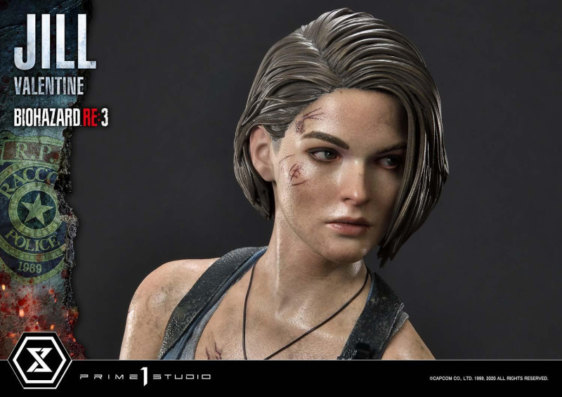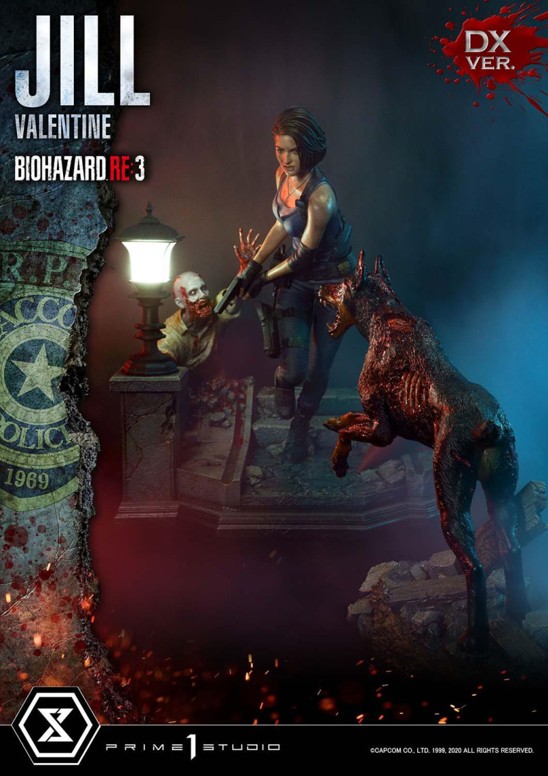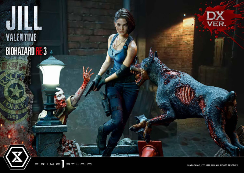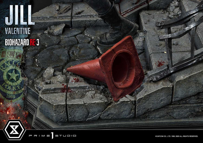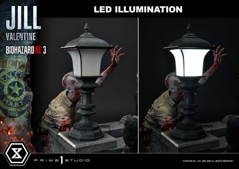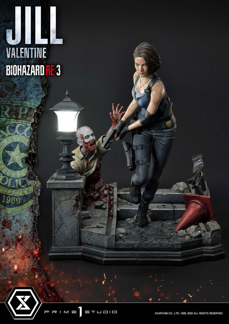 由 Prime 1 Studio 所製作的這款吉兒・華倫泰之 1/4 比例立體雕像,整體高度約50公分,還原了她在重製版3遊戲中的模樣,以預設的藍背心搭配長褲為造型,吉兒單手持槍奔跑的動作模樣。表情零件有兩種可以替換。在石階狀的台座後方,是一隻沒了下半身,已經被開膛破肚的殭屍在追擊吉兒,看起來相當逼真。吉兒身上的各處細節,例如鎖骨附近的傷痕,身上掛的卡洛斯給的無線電、槍套等等,也都相當細膩地一一還原做出來。一旁的路燈可以透過電池的方式點亮,整體非常有拉昆市的災難感。