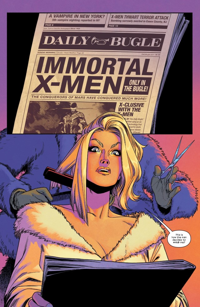 首先,最嚴重的,就是《X-Men》第十二期當中獨眼龍(Cyclops)和同步(Synch)把變種人得到永生的消息放給號角日報(Daily Bugle)記者班‧尤里克(Ben Urich)這件事情。負責舉辦慶典的白皇后(White Queen)對此可是非常不高興。