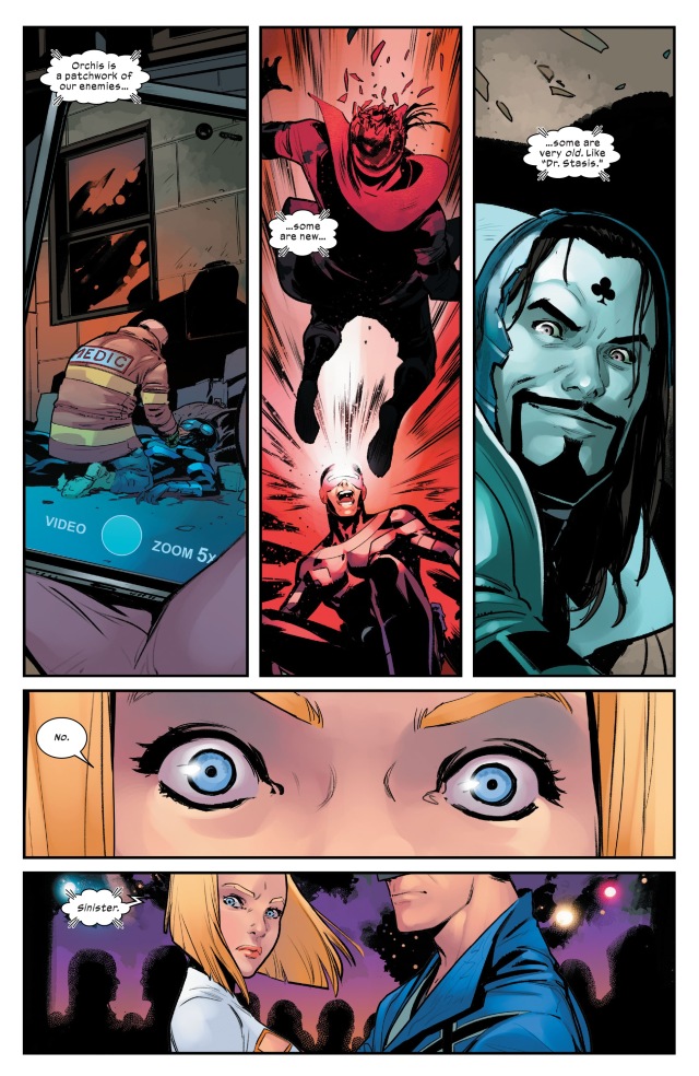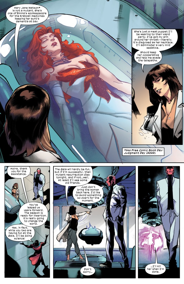 而在紅蘭局(Orchis)這邊,完全成為變種人反派的莫伊拉(Moira)加入了飛龍(Feilong)和靜滯博士(Dr. Stasis),並在先前的故中綁架了白皇后雇來代言克拉科藥物的瑪莉珍‧華生(Mary Jane Watson),並將自己的一隻機械手臂綁在她脖子上偽裝成項鍊來控制她,好作為自己潛入慶典的替身。