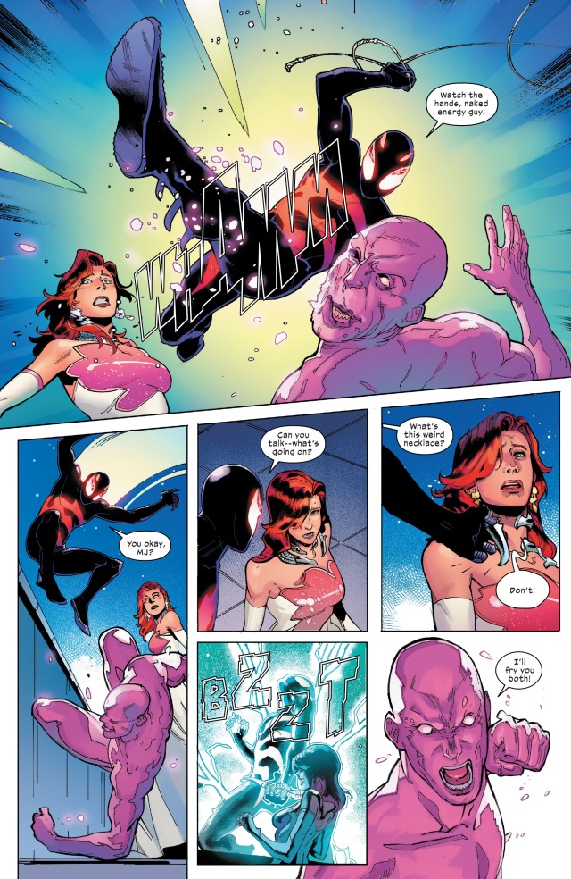 受邀出席的蜘蛛人在發現瑪莉珍發出的SOS訊號的譯碼(Cypher)的提示下前去攪局,但是他並沒有真的搞清楚狀況