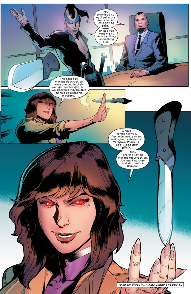 最後,莫伊拉找上了另一批能夠協助她摧毀變種人的強力盟友,並將使變種人復活的關鍵人物告訴了他們——永恆族!