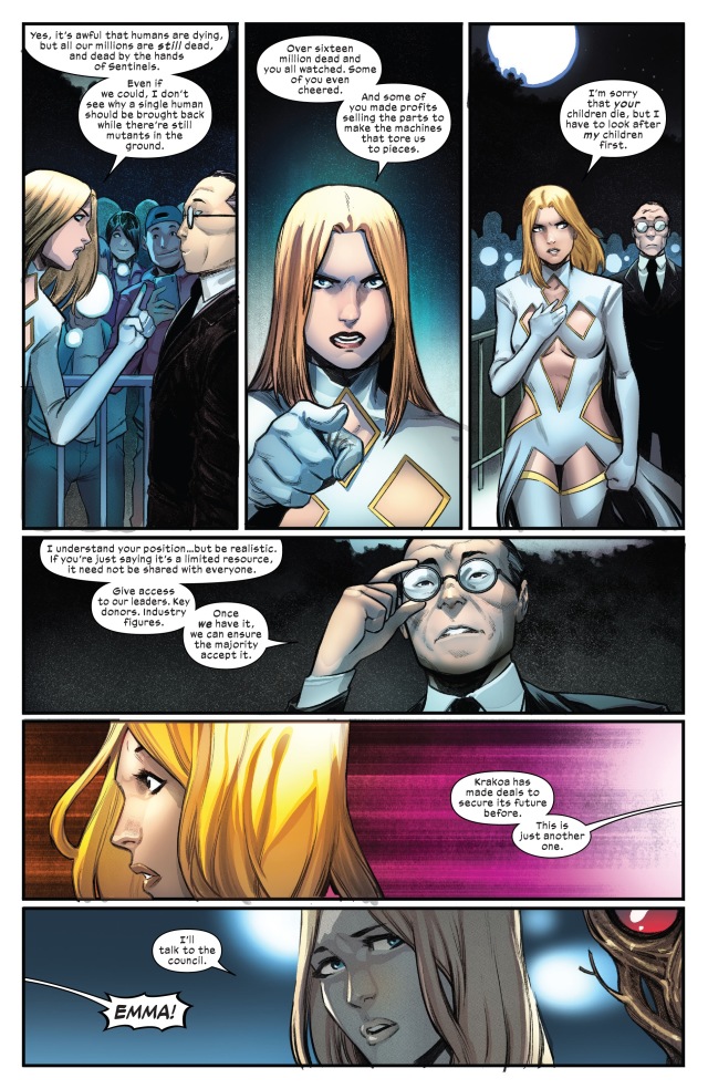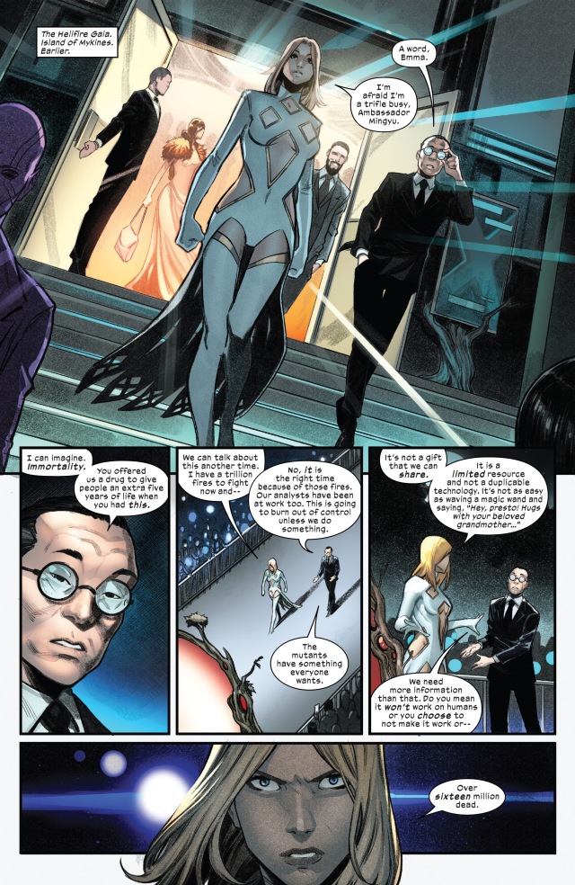 除了這些問題之外,從《House of X》時期登場的中國對克拉科大使馬明宇也對變種人的永生有著自己的提案。確實,現在克拉科提供的資訊並不完全,大家不知道變種人是不願提供給人類永生還是做不到這一點。