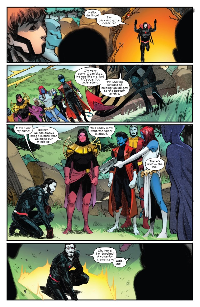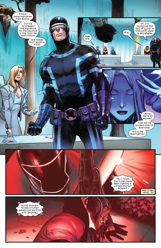 這個星期的地獄火慶典上除了莫伊拉的入侵以及新一代X戰警的選舉之外,最重要的事情就是獨眼龍(Cyclops)讓議會成員知道了變種國克拉科(Krakoa)的凶兆先生(Mr. Sinister)與反變種人組織紅蘭局(Orchis)的靜滯博士(Dr. Stasis)之間的關聯。