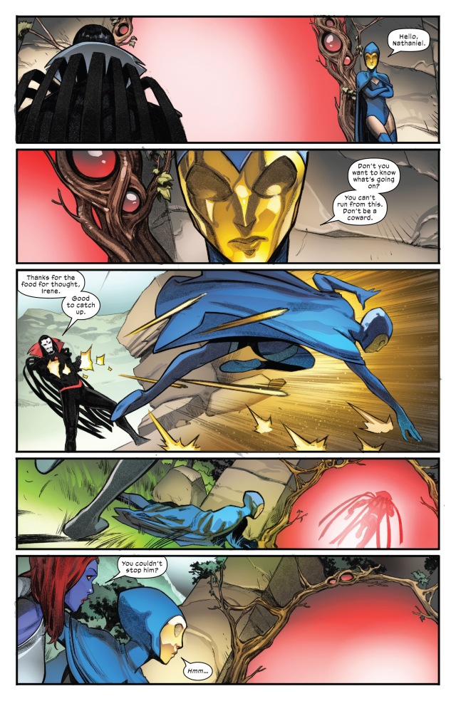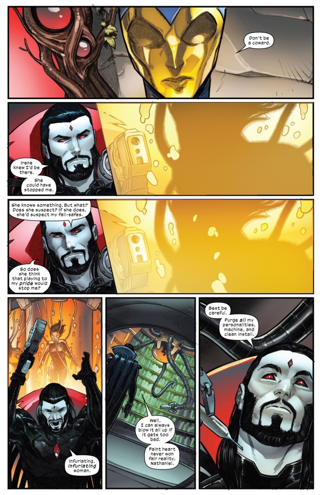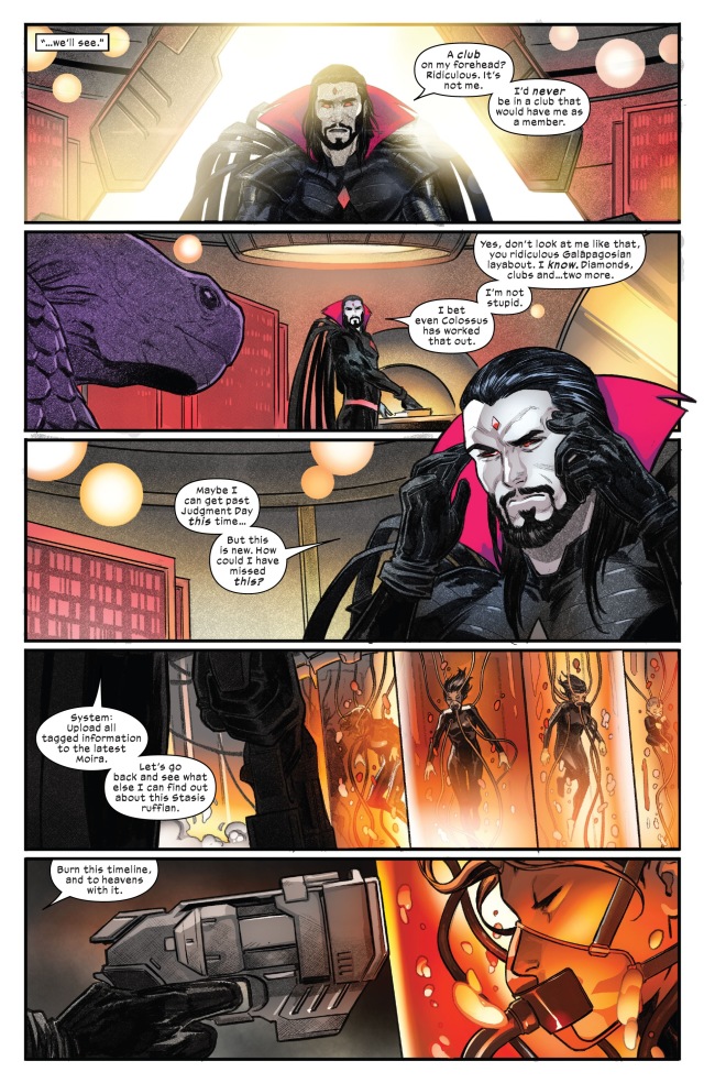 顯然不只是讀者,就連凶兆也在懷疑是否還有另外兩個頭上有黑桃和紅心的納森尼爾‧埃賽克斯存在。不只如此,他似乎已經多次經歷過接下來的大事件《審判日》並僥倖透過莫伊拉的變種能力回朔到之前的時間點,卻從來沒有遇過靜滯博士的事件。不知道這次究竟有何不同?