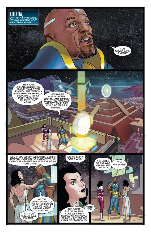 他以為一群祭司做不出什麼大事,但是艾賈克(Ajak)和瑪卡瑞(Makkari)這兩位被電影版給變性了的祭司可是有著超乎想像的計謀:他們要造出一位天神!