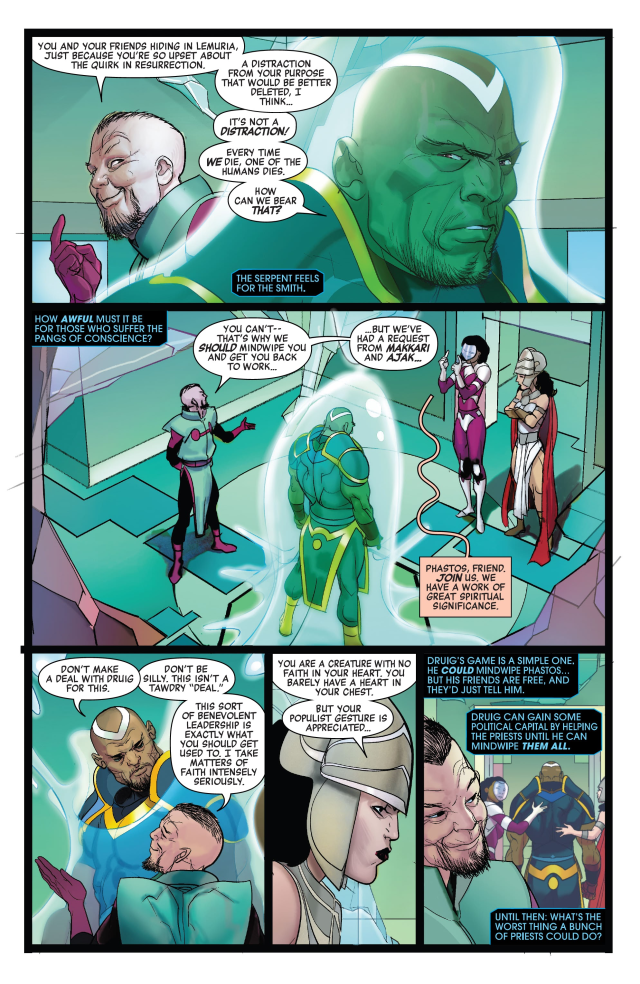 然而這件事情要說到永恆族這邊的部分了。先前我們看到永恆族至尊諸克(Druig)打算用反物質炸彈直接摧毀克拉科,但是於此同時他也在與永恆族內不服從他的派系進行政治角力;而其中一環就是把自己的囚犯費斯托斯(Phastos)交給天神族祭司(The Celestian Priests)們。