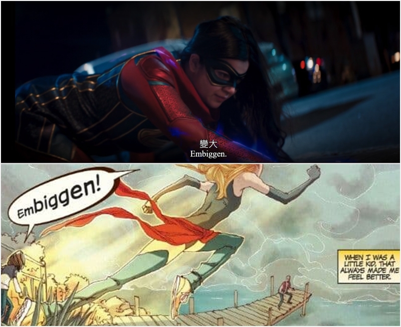 卡瑪拉喊了一聲 "Embiggen" 後開始放大,這也是漫畫中她的口號之一。