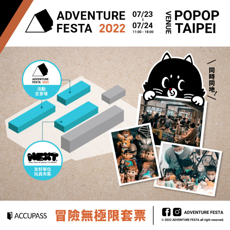 ADVENTURE FESTA (以下簡稱 AF )矢志以「原創角色」為核心,結合「冒險」與「嘉年華」元素,首屆邀請來自日、韓、馬、泰、中、港、台七地的平面、立體、數位藝術創作者與品牌,共同迎向充滿挑戰與想像力的冒險旅程。一場別開生面的原創角色盛典,就在 7月23日、24日,於南港瓶蓋工廠台北製造所等待您的蒞臨!