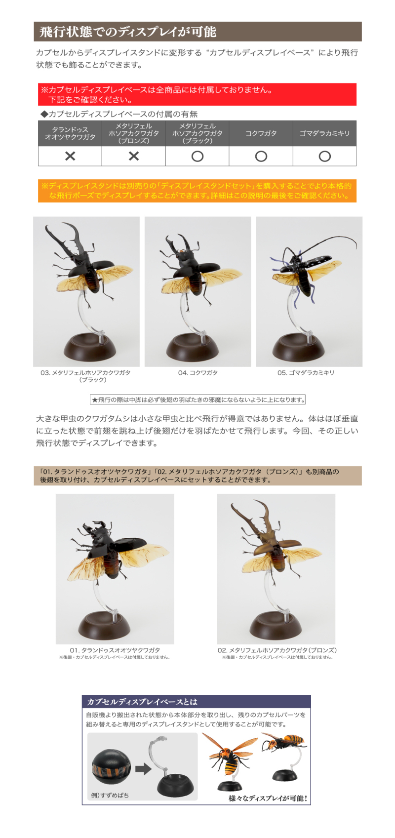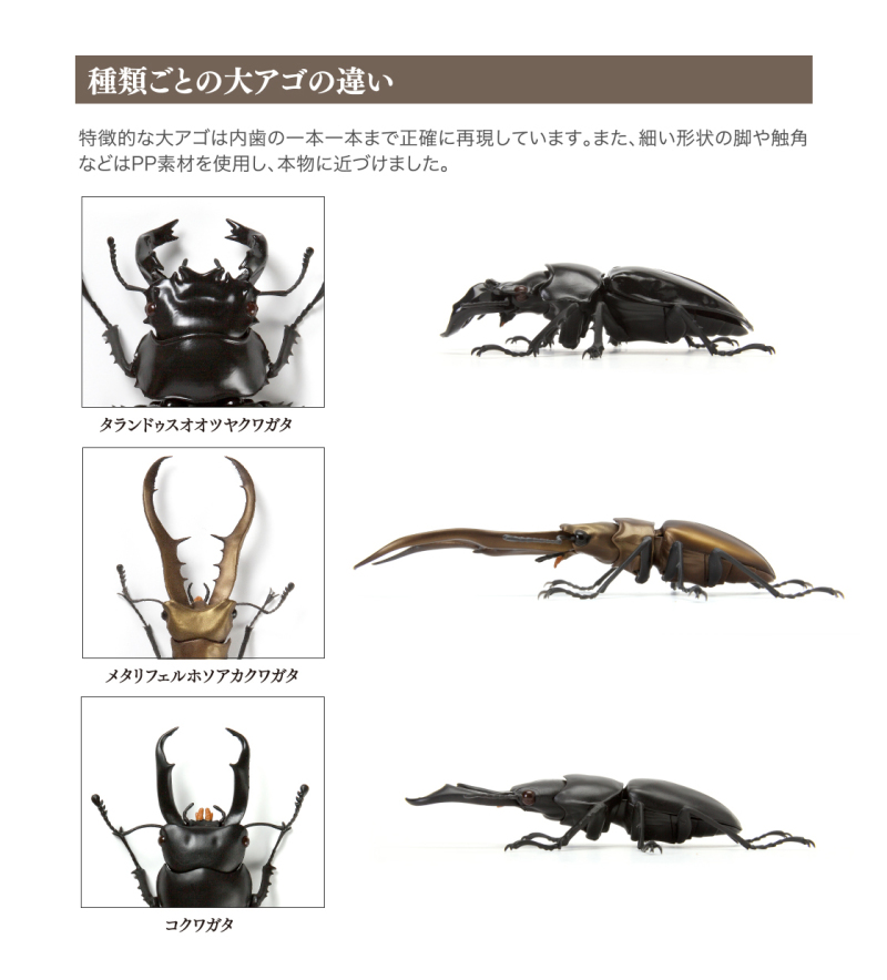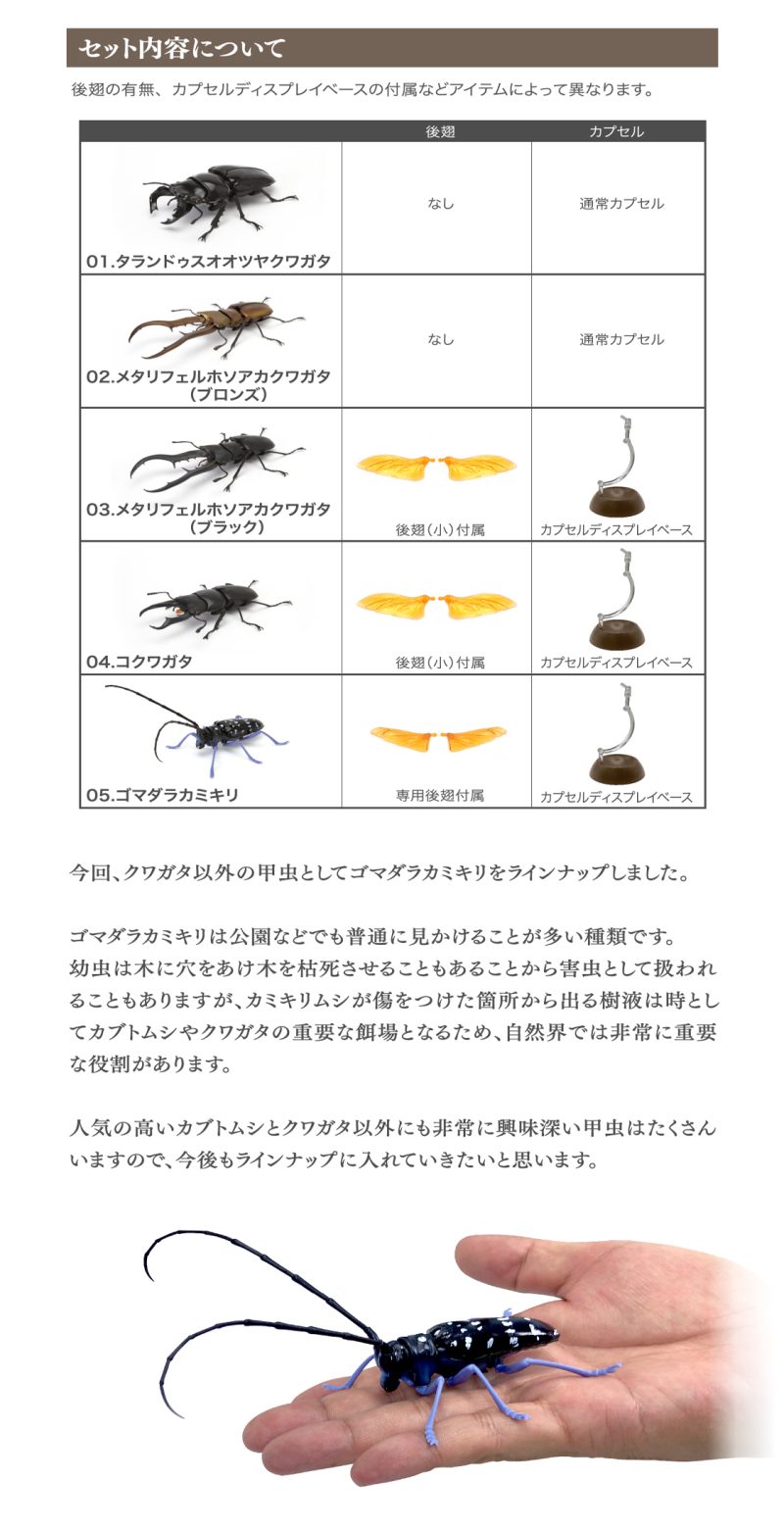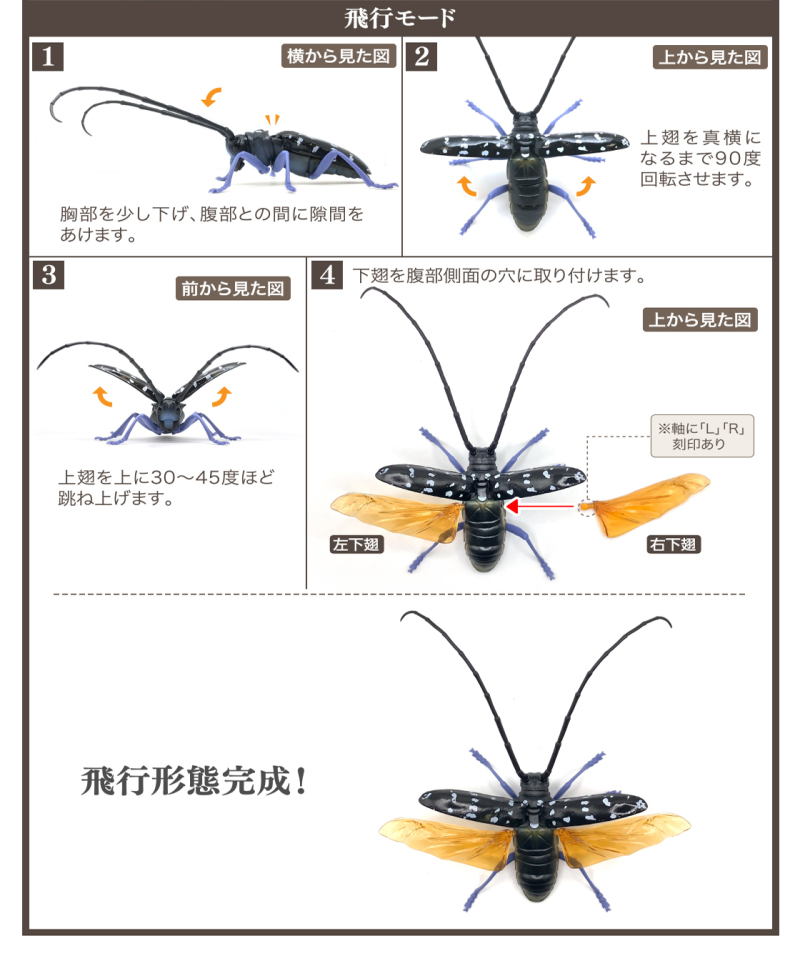 人氣甲蟲「GASHAPON 鍬形蟲04 轉蛋」以全長 95 mm的大尺寸打造,將非洲大黑豔鍬形蟲、美他利佛細身赤鍬形蟲(銅色/黑色)、小鍬形蟲、馬拉白星天牛五款昆蟲的真實標本以 3D 建模徹底還原,塗裝更是精細呈現油亮的甲殼;並透過 17 個可動關節與內部活動機構設計,完整重現身體結構,包含大顎、觸角與腹節等生物細節,並以透明材質呈現翅膀細節,可以擬真展翅再現飛行型態!