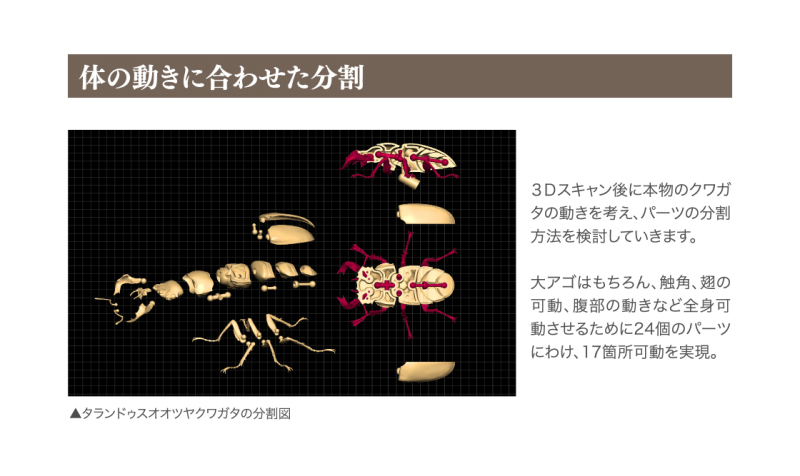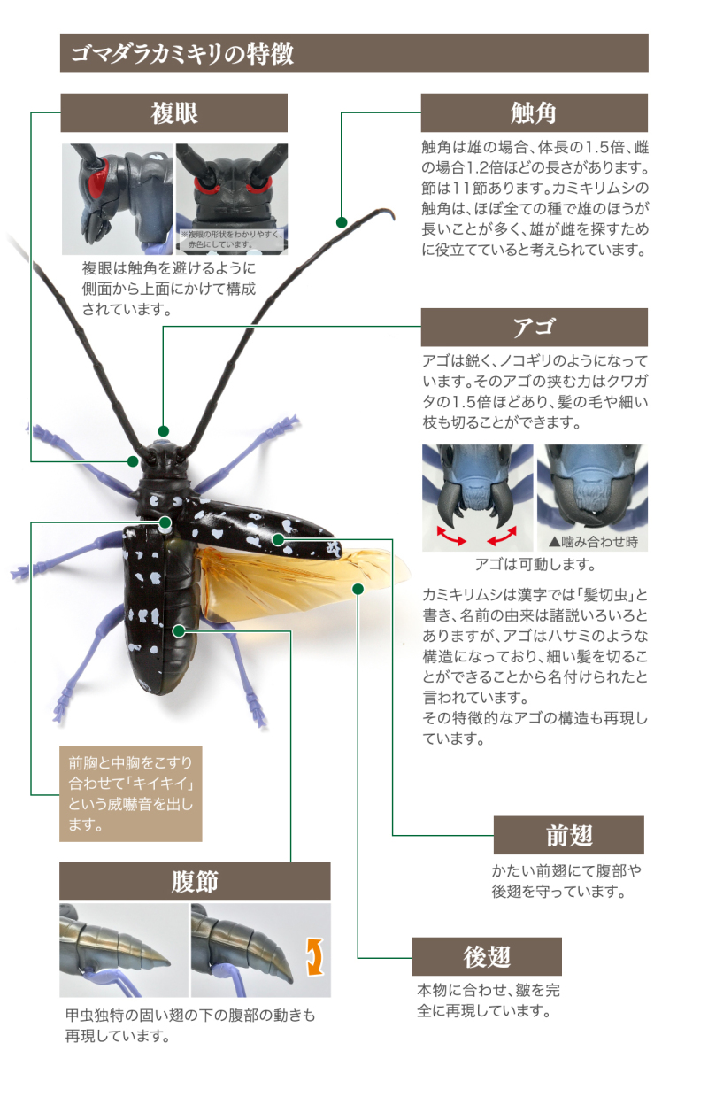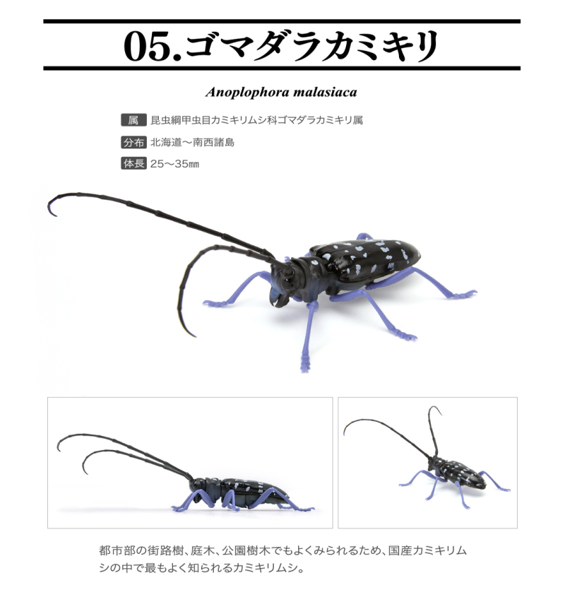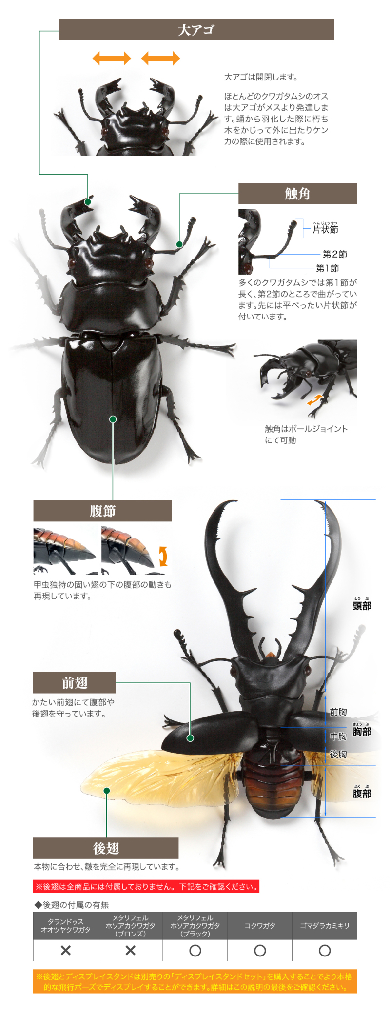 人氣甲蟲「GASHAPON 鍬形蟲04 轉蛋」以全長 95 mm的大尺寸打造,將非洲大黑豔鍬形蟲、美他利佛細身赤鍬形蟲(銅色/黑色)、小鍬形蟲、馬拉白星天牛五款昆蟲的真實標本以 3D 建模徹底還原,塗裝更是精細呈現油亮的甲殼;並透過 17 個可動關節與內部活動機構設計,完整重現身體結構,包含大顎、觸角與腹節等生物細節,並以透明材質呈現翅膀細節,可以擬真展翅再現飛行型態!