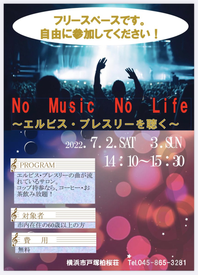 「♪No Music No Life♪ 」則是該扶老中心長期舉辦的活動,先前也舉辦過貓王 Elvis Presley 的音樂會,大多選擇早期的樂團或歌手來給這些長輩回味當時的音樂風潮,當然也有日本 70 或 80 年代的流行樂。