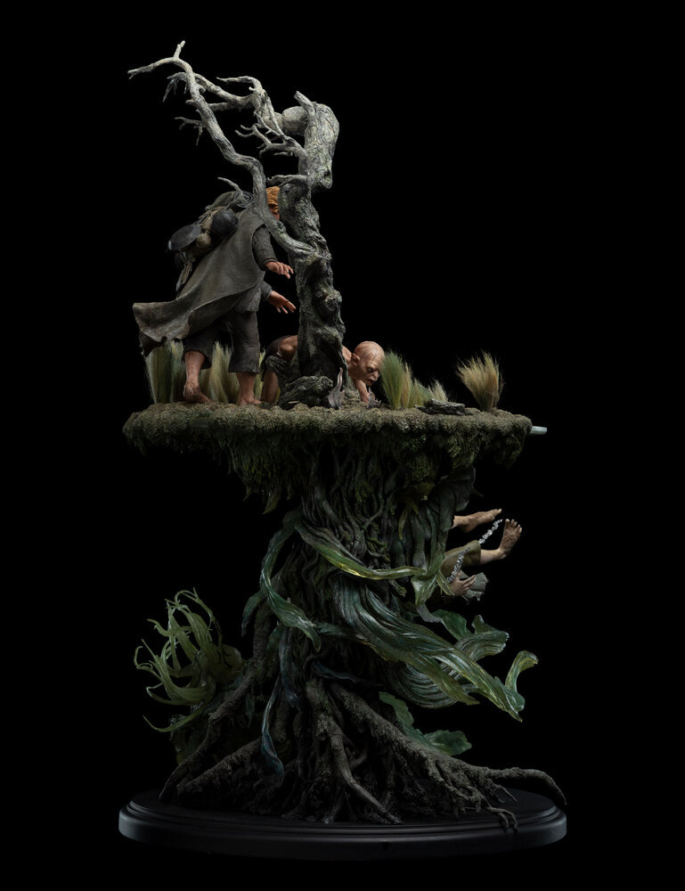 WETA 這次以令人驚豔的造型力充分還原劇中佛羅多墜入沼澤,慌亂的山姆與咕嚕正準備營救的緊張時刻,藉由角色動態感的形塑與本作搭載的 LED 發光功能,不只鮮明地表現出水下的飄動感與緩慢流逝的時間,異樣的燈光也傳達出長年累積死者靈魂之處的駭人氛圍,而咕嚕伸往水面下的手更是打破現實與幽魅世界、救回佛羅多的突破口!在雜草的逼真質感、枯木的造型、妖怪猙獰的臉部神情......等細節都有出色表現,漂浮著的魔戒項鍊也更加凸顯了正在下沈的佛羅多,整體真的非常精彩!