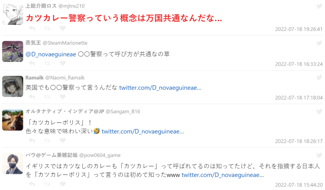 對於這個現象有興趣的朋友,可以在推特上搜尋#カツカレーポリス,會有不少日本網友當起「豬排咖哩警察」的推文,不過因為英國對日式咖哩的稱呼引發這種現象,看來網路警察現象果然國際化的阿 XD。