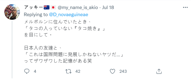 不過這樣的稱呼現象其實不少見,有住在澳洲的網友就表示,在墨爾本看到沒有章魚的章魚燒,對於日本人來說,這樣的國際發展現像真的很...特別 XD。 ( 這邊就成為了章魚燒警察了... )