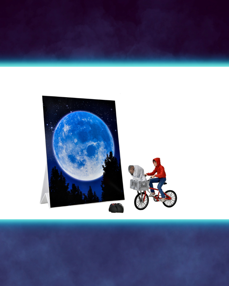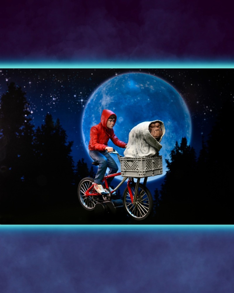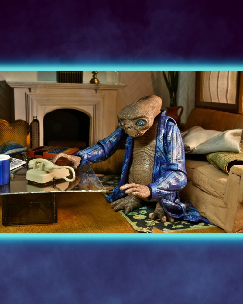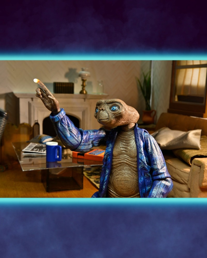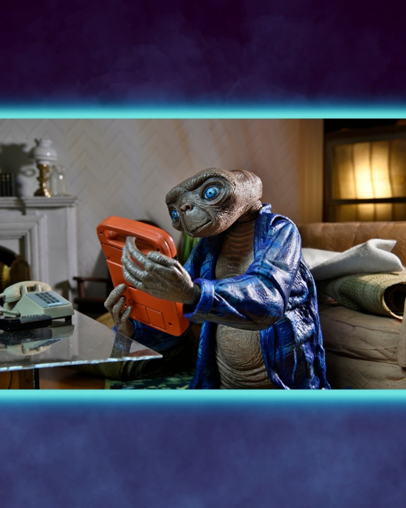 《E.T.外星人》,講述一位被困在地球的善良外星人 E.T,與男孩埃利奧特(Elliot)互相認識並且成為好朋友的故事,享有「有史以來最偉大的科幻片」的讚譽;E.T 會發光的長手指是他的招牌特色,劇中的經典台詞:「E.T PHONE HOME.」(E.T. 打電話回家)更是紅遍當時;這次的可動人偶陣容可以讓各位玩具人重現劇中的豐富場景,除了經典的飛天畫面之外,變裝 E.T.、穿著藍色睡衣的 E.T.,以及為了聯絡故鄉所打造的「臨時通訊裝置」配件......等都相當不錯!又想再去回味一次電影了啦!