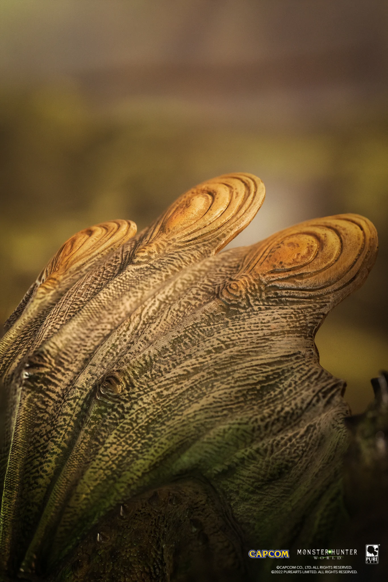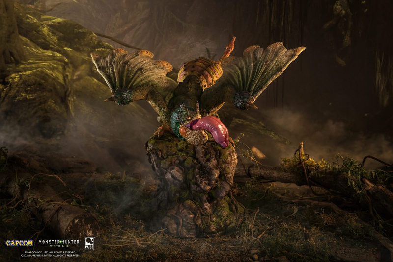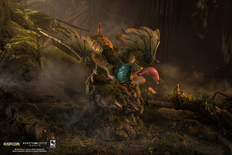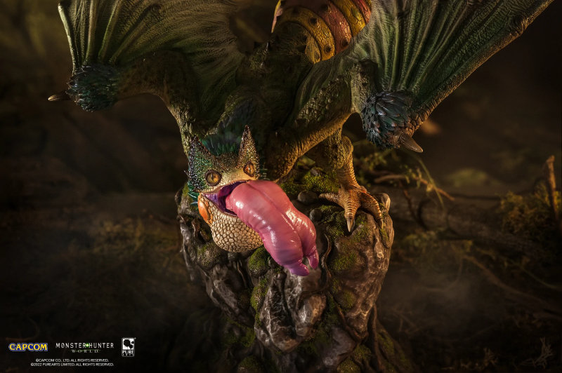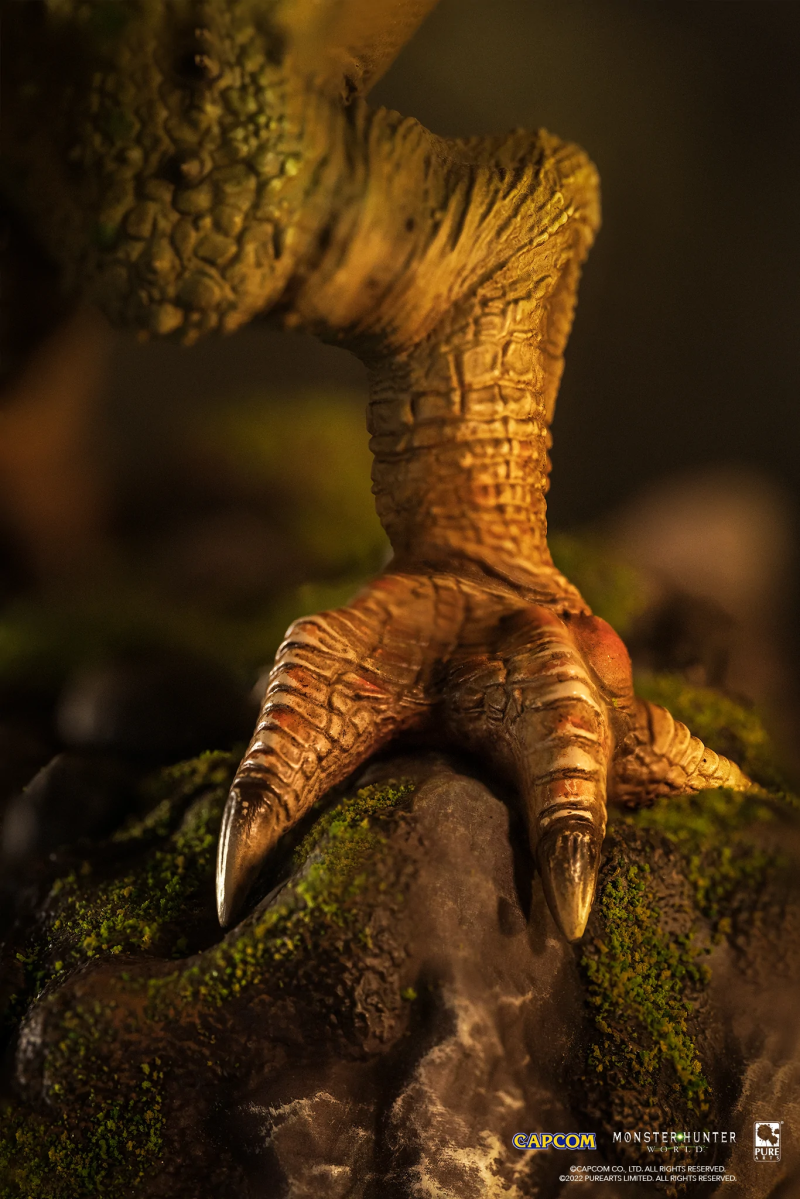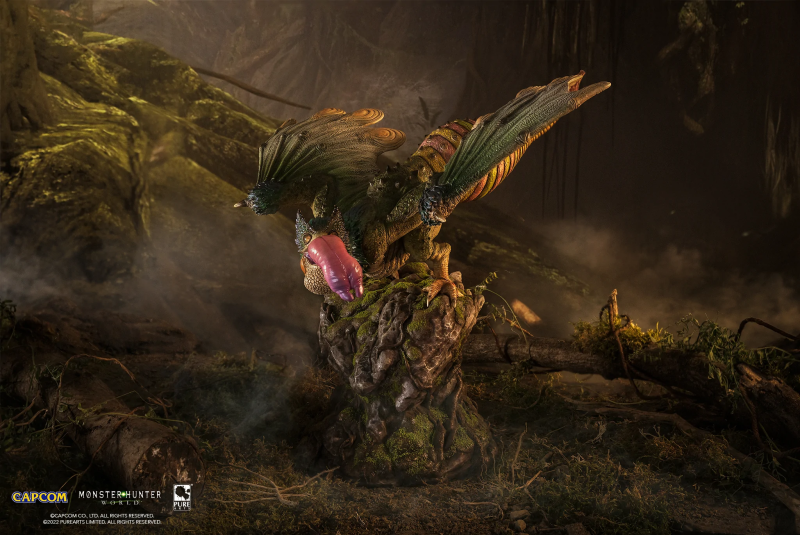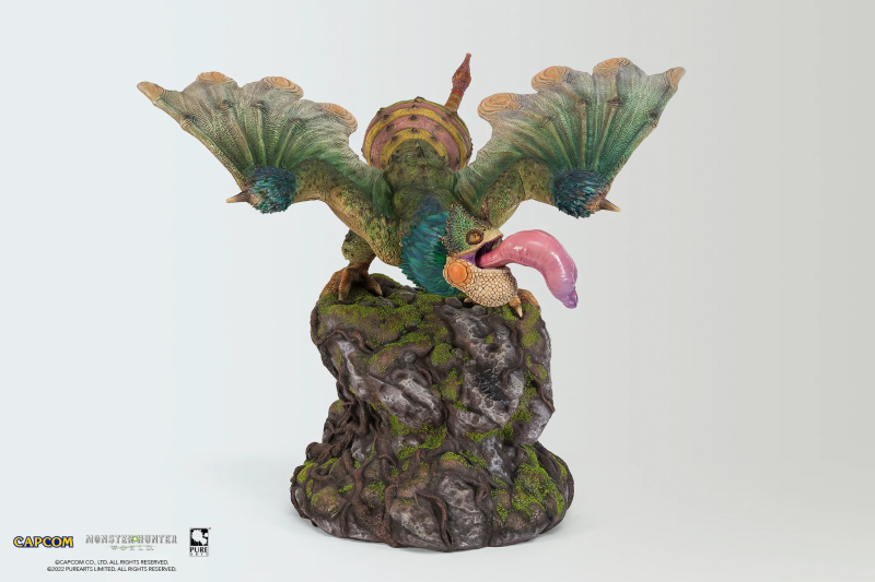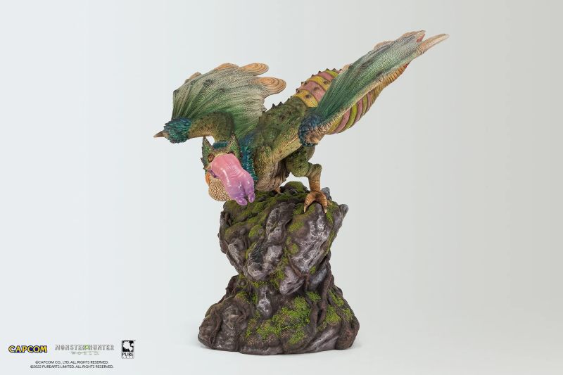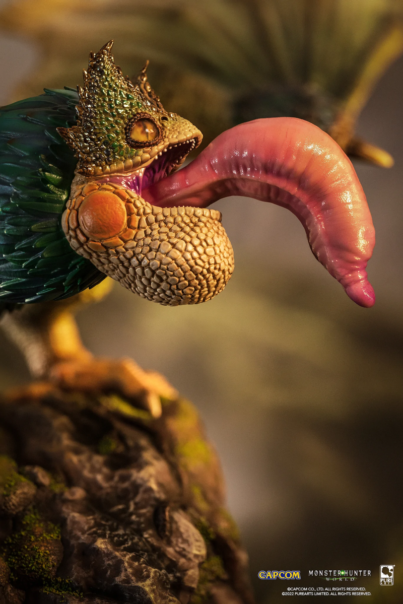 本作高約 44.4 公分,依照《魔物獵人 世界》的設定考究再現了「毒妖鳥」站立在佈滿岩石之林地的場面,色彩鮮豔的頭部、與爬行動物如出一徹的鱗片、綠色的羽毛、渾圓的喉袋、腫大的尾巴,以及頂端有著圓盤構造的翼骨......等特色皆充分還原,除了全身極具生物感的漸層上色之外,通透的雙眼、滑嫩的舌頭都相當精彩!加上逼真表現出堅硬岩石、嫩綠苔蘚的場景底座,大幅提升了整體感並傳達出《魔物獵人 世界》的世界觀元素。