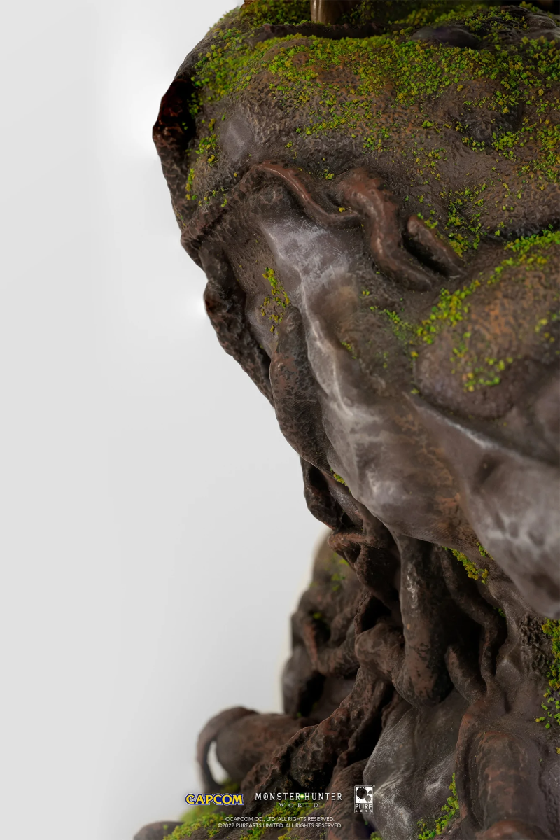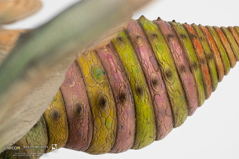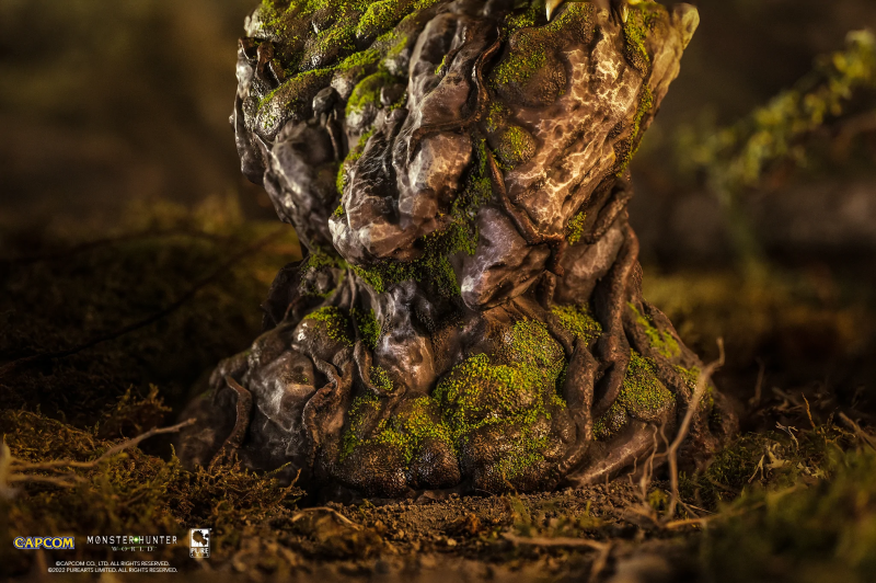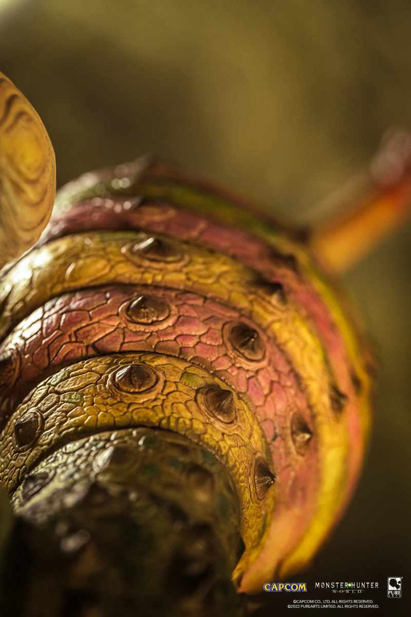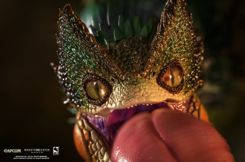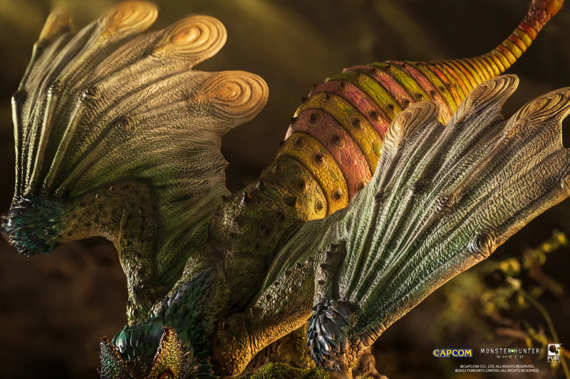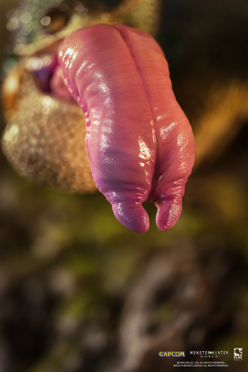 本作高約 44.4 公分,依照《魔物獵人 世界》的設定考究再現了「毒妖鳥」站立在佈滿岩石之林地的場面,色彩鮮豔的頭部、與爬行動物如出一徹的鱗片、綠色的羽毛、渾圓的喉袋、腫大的尾巴,以及頂端有著圓盤構造的翼骨......等特色皆充分還原,除了全身極具生物感的漸層上色之外,通透的雙眼、滑嫩的舌頭都相當精彩!加上逼真表現出堅硬岩石、嫩綠苔蘚的場景底座,大幅提升了整體感並傳達出《魔物獵人 世界》的世界觀元素。