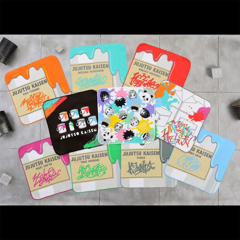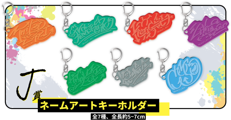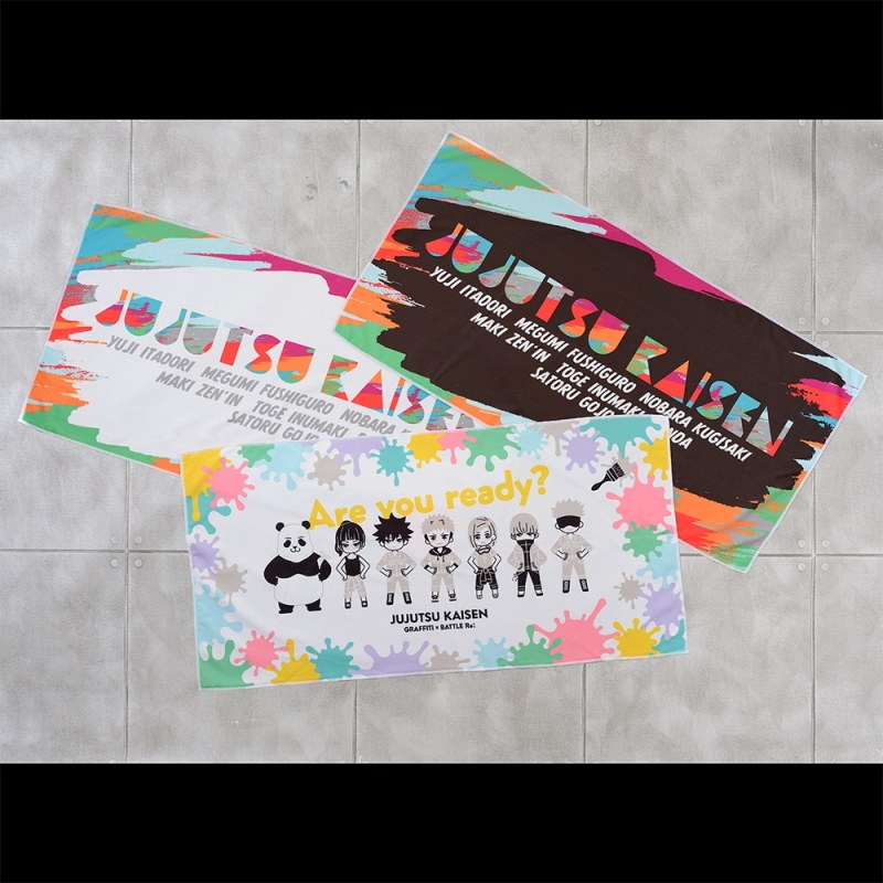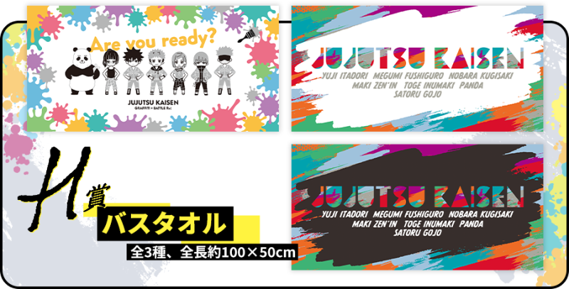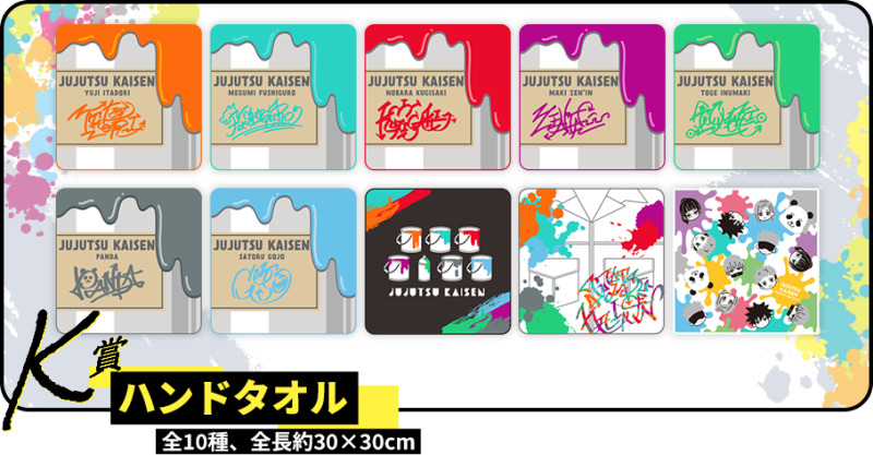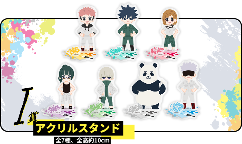 「LUCKY賞 咒術迴戰 GRAFFITI×BATTLE Re:」以先前的 GRAFFITI×BATTLE 視覺圖為基礎,將穿著工作服、推拿著油漆,五顏六色的繽紛造型立體化!收錄有 A賞 ~ G賞 共七款的角色模型,分別為虎仗悠仁、伏黑惠、釘崎野薔薇、禪院真希、狗卷棘、熊貓以及五條悟,生動的姿勢加上符合角色性格的噴漆配色,造型充滿歡樂又可愛的氣氛~最後賞更是有 SP Ver.特別配色的虎仗!另外還有浴巾、壓克力支架、藝術鑰匙圈以及手巾等獎項~