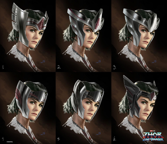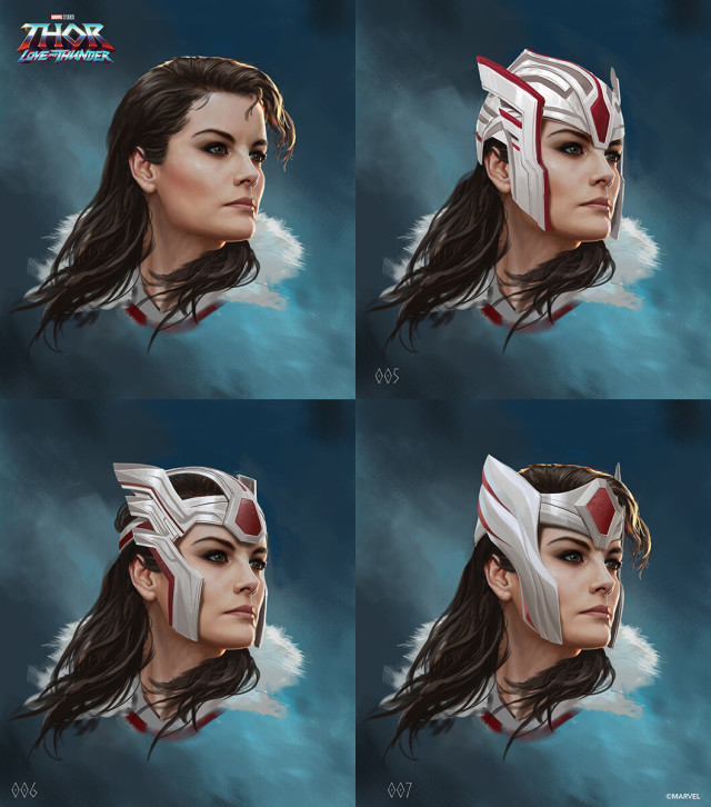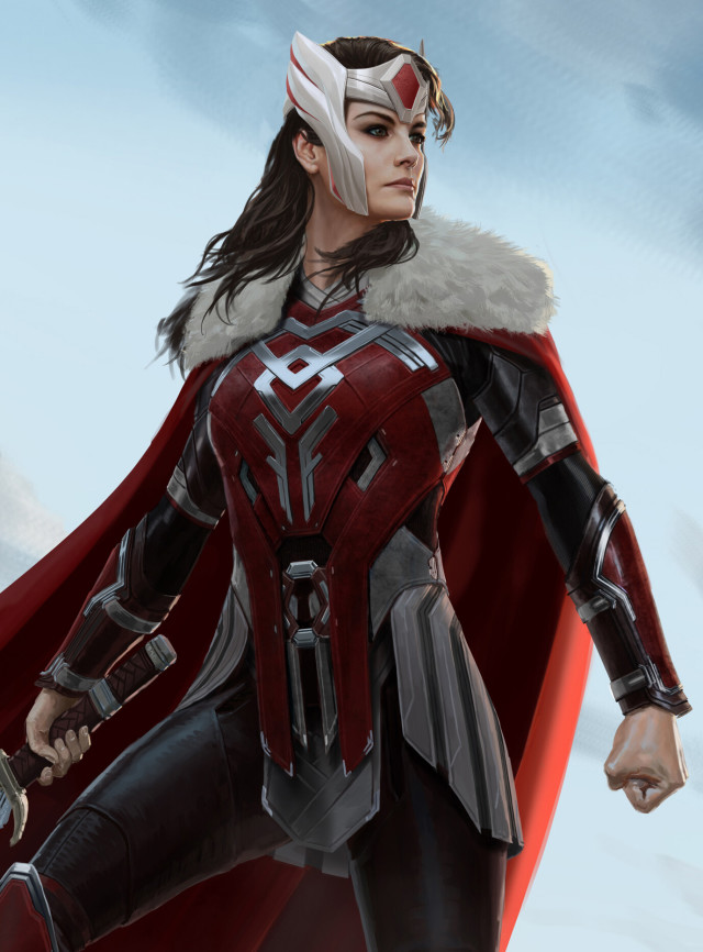 而同樣採用絨毛披風的,也包含了John Staub為「希芙 」所繪製的初始概念設計,當然在頭盔的設計上,也採用了與服裝相襯的紅白配色,恰好也與雷神的暗色系作為對比。