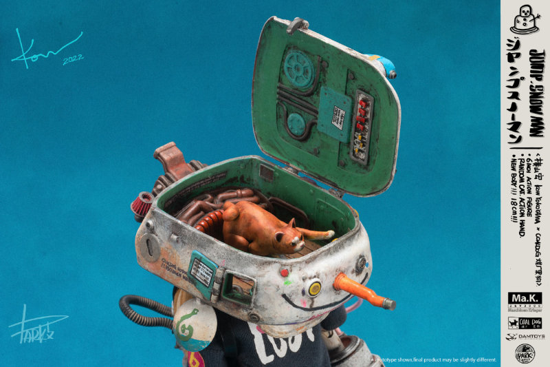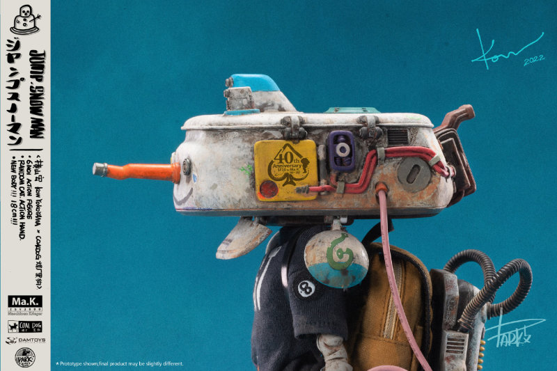 這次的「跳躍雪男」擁有十分可愛的角色設定:在一座無人的城市裡,雪男持續帶著貓咪流浪,尋找沒有被打開過的罐頭;採用高約 18 公分的「鋼鐵之心」機械素體,在呈現出未來廢土風格的同時,充分展現橫山宏大師機械設定的魅力與 Parkzhi 極具巧思的設計特色,機械零件雖是以灰白色為主基調,但是在上頭加裝了許多顏色繽紛的零件,跟看起來有點滑稽的外觀可說是搭配得天衣無縫!除了可在頭部側邊看到《Ma.K》40 週年的紀念 LOGO 之外,更能掀開頭頂把玩內部的駕駛艙細節,相當有趣。