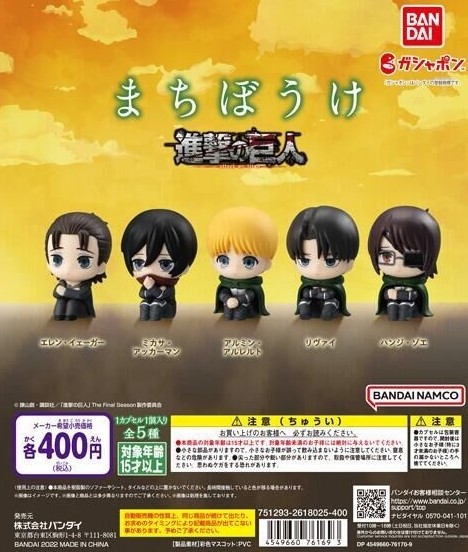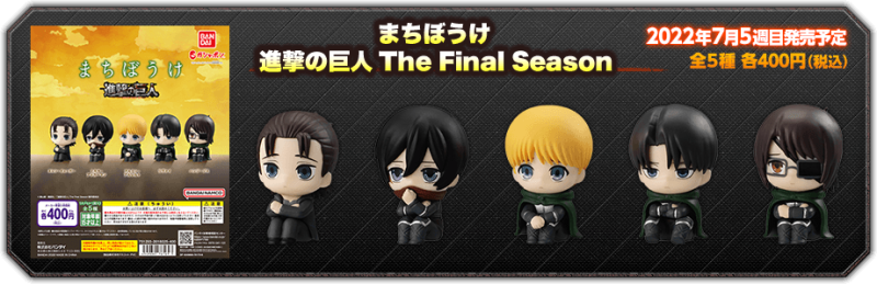 萬代公司旗下轉蛋事業部 GASHAPON 發行的大好評轉蛋作品「等待中的動物」系列,在「等待中的野菜」、「等待中的UMA」等多款企圖有所突破的商品後,這次將推出新作:「等待中的進擊的巨人The Final Season 」轉蛋!款式共有五種,一轉參考售價為 400 日圓,預計將於 2022 年 07 月下旬開轉。