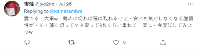 不過カマタミワ後續的方法...,是對西瓜抱以滿滿的愛,替它拍照跟它示愛,百般疼愛之後,再盡量沿著西瓜籽的排列線條切割,通常這樣切下來的西瓜,會比較好處理西瓜籽。但...カマタミワ表示這樣吃還是很多西瓜籽,只能說就算用愛也是無法把西瓜籽好好去除享用阿 www。