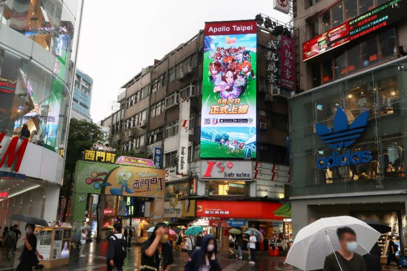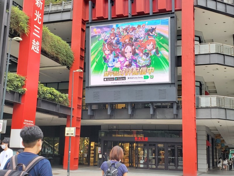 不僅如此,商圈電視牆(台北市南西商圈、西門商圈、台中市一中商圈、高雄市漢神巨蛋百貨商圈)、超商LED廣告(7-11、全家)、小巨蛋、公車、台北地下街等,鋪天蓋地、隨處可見的賽馬娘颯爽身姿,也讓不少玩家心潮澎湃,引發熱烈討論。