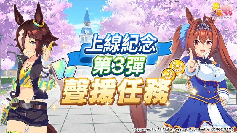 目前遊戲内正在舉辦上線紀念活動第三彈,最多可以獲得750個寶石、金幣及支援Pt等豪華獎勵!訓練員們,快與賽馬娘們一起朝勝利前進吧!